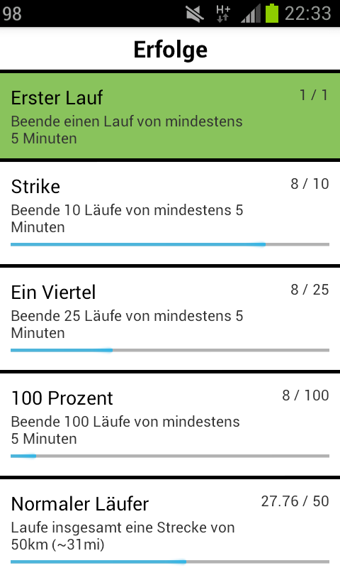 Fast jeder läuft um sich gesetzte Ziele zu erreichen. Sei es erstmals einen Lauf über eine bestimmte Distanz erfolgreich zu bewältigen oder einen neue Bestzeit im Marathon aufzustellen. Der Route Runner bietet eine lange Liste von 25 zu erreichenden „Erfolgen“, wie z.B. einen, zehn, 25 und aber auch 100 Läufe von mindesten fünf Minuten zu beenden. Auch Streckenziele, wie insgesamt 1.000 km zu Laufen oder Kalorien und Geschwindigkeitsvorgaben können erreicht werden.