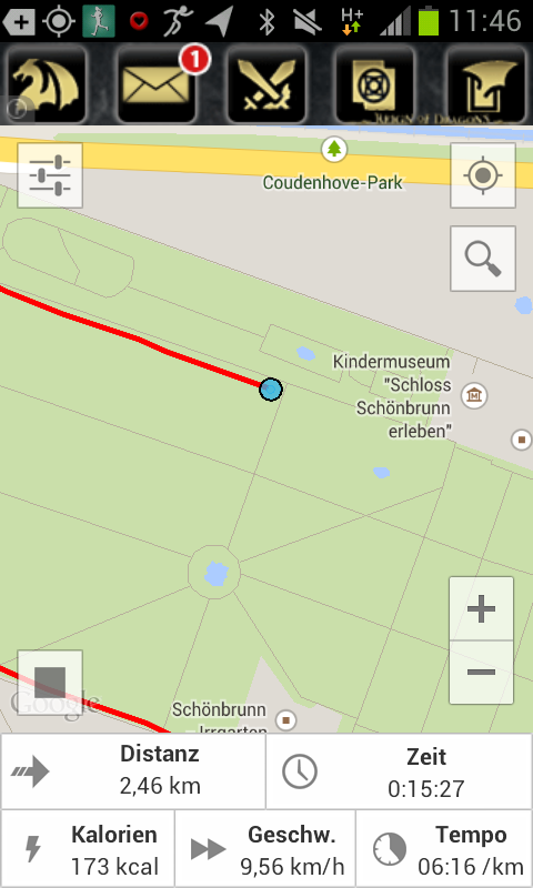 Workouts wie z.B. Distanz oder Zeitvorgaben gibt es keine. Der Route Runner spezialisiert sich, wie der Name schon sagt auf die Routenführung. Angeboten wird die Routenführung durch eine benutzerdefinierte Route, aber auch durch eine zufällige Route, die automatisch anhand des aktuellen Standortes und der Distanzvorgabe erstellt wird. Als Methoden kann man „Fußgänger“, „Radfahrer“ und „Autofahrer“ angeben. Die Routen für Fußgänger und Radfahrer eignen sich Bestens für Läufer, wobei es bei der zufälligen Routenerstellung auch zu Problemen kommen kann. So führte eine Route für Radfahrer durch den Schlosspark Schönbrunn, der allerdings nicht für Radfahrer zugänglich ist. Läuft man eine Route ab, wird man per Audio immer 75 m (bzw. je nach Einstellung) vor einem Wendepunkt über die Kursänderung informiert. Als weitere Workout-Möglichkeit gibt es noch den Aktivitätslauf, der mit einem Intervalltrainings zu vergleichen ist und in dem folgenden Kapitel vorgestellt wird.