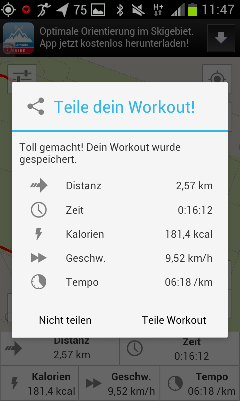 Der Startbildschirm ist etwas gewöhnungsbedürftig, da direkt eine Karte angezeigt wird. Klickt man auf den Play-Button, kann man div. Einheiten starten oder absolvierte Workouts und Erfolge ansehen. Links oben kann man wenige Einstellungen verändern. Während der Einheit werden fünf nicht konfigurierbare Parameter (Distanz, Zeit, Kalorien, Tempo und Geschwindigkeit) zu der Mappe angezeigt.