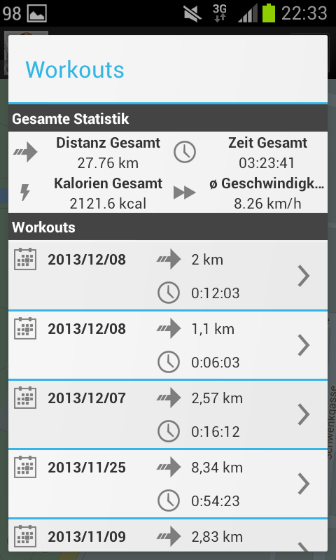 einen Intervall machen. Wobei der Intervall (in hoher Geschwindigkeit) die 30 Sekunden sind und die zwei Minuten die niedrige Intensität. Sowohl Minuten als auch Sekunden lassen sich auch durch Kilometer ersetzen. Die Sprachausgabe für Intervalle kann aktiviert werden, zusätzlich gibt es auch eine normale Sprachausgabe jeden km (oder individuell, allerdings nur auf Kilometer, konfigurierbar). Startet man einen Aktivitätslauf mit „alle eine Minute für 30 Sekunden“, so informiert der Route Runner nach einer Minute das die Aktivität startet und nach weiteren 30 Sekunden, das die Aktivität beendet ist, nach einer weiteren Minuten wird erneut über den Aktivitätsstart hingewiesen usw.. In der Workout-Statistik nach einer Einheit werden jedoch die einzelnen Splits der Aktivitäten bzw. Intervalle nicht gespeichert.