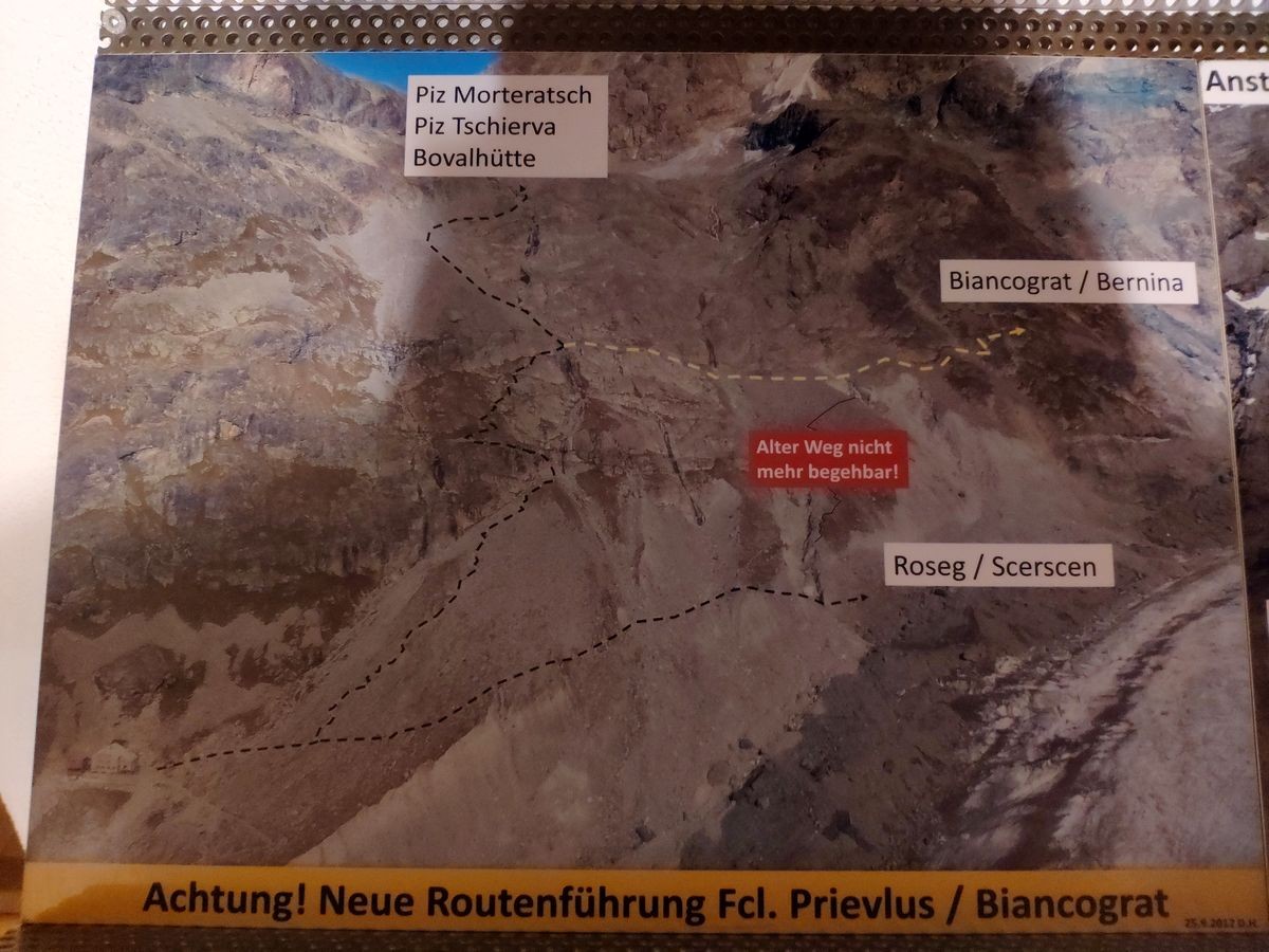 Ansonsten mit dem 2. Auto beim Bahnhof Morteratsch (gebührenpflichtig) parken um die Tour im Abstieg um sechs Kilometer zu verkürzen.