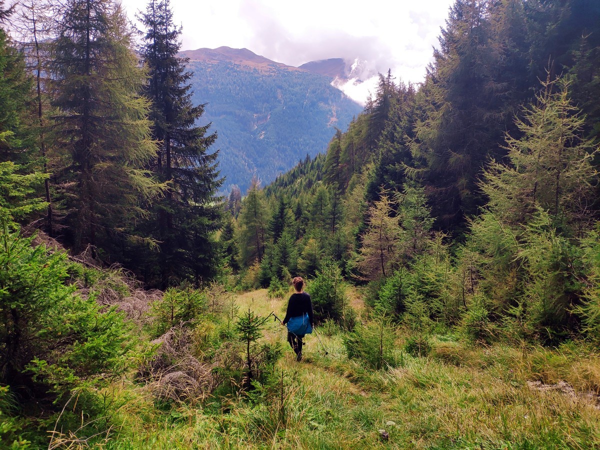 - Kurz nach der Blaserhütte gibt es nun eine Abzweigung, wo entweder der Abstieg weiter rechts über eine Forststraße (länger) oder geradeaus neben dem Talbach (steiler; Weg 31) möglich ist.
