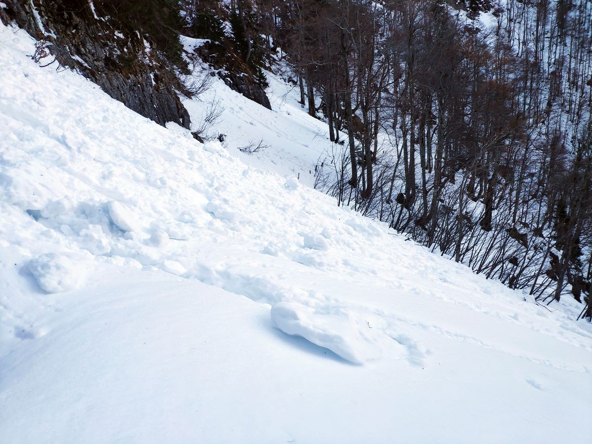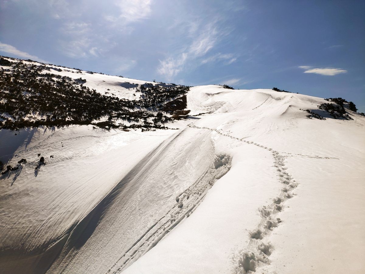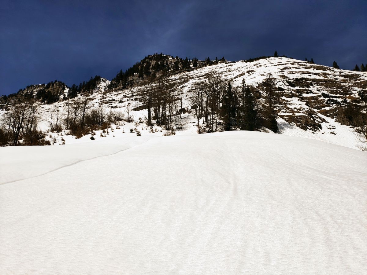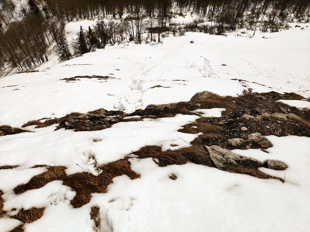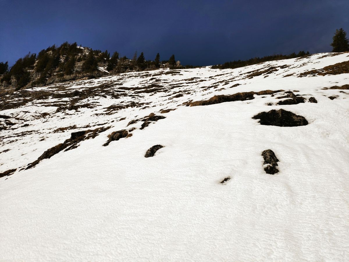 Im Aufstiegsweg ist nur der Schlussabschnitt markiert. Ansonsten nicht markierter Weg im Aufstiegs. Die Abstiegsroute ist markiert.
