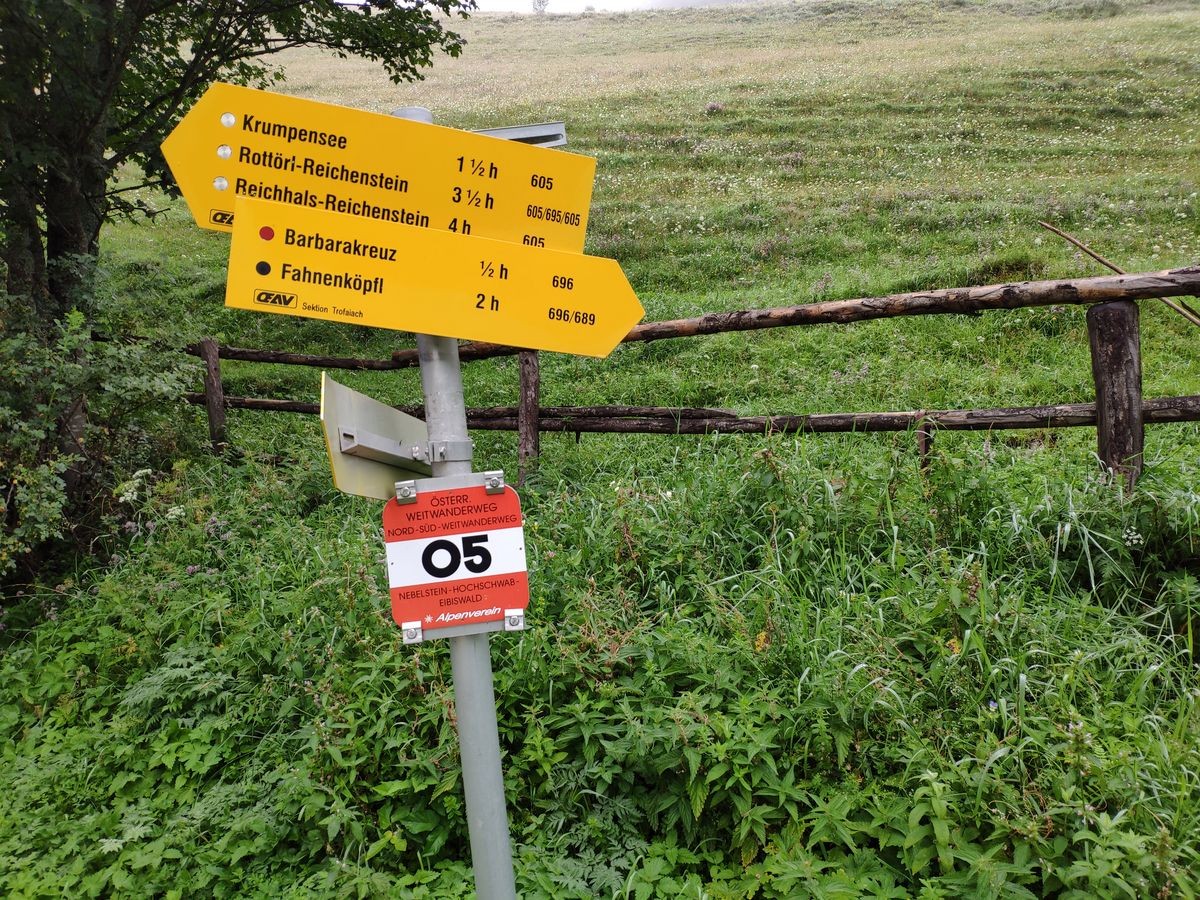 Parkplatz Hirneralm - Weg 696 zum Barbarakreuz / Fahnenköpfl - Wiesenmulde (nicht markiert) nordöstliche zu einer Forstraße - markierter Wanderweg zum Barbarakreuz - markierte Route zum Grete Klinger Steig - danach durchgehend markiert - nach Ende des Steigs gut markiert und beschildert bis zum Gipfel - vom Gipfel direkt zum Reichensteinhaus - Abstieg über Rottörl und Krumpensee (markiert) zur Hirn-Alm
