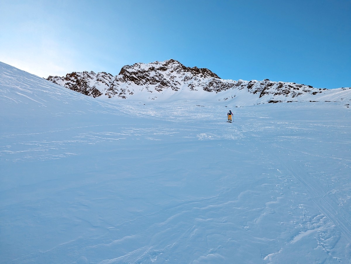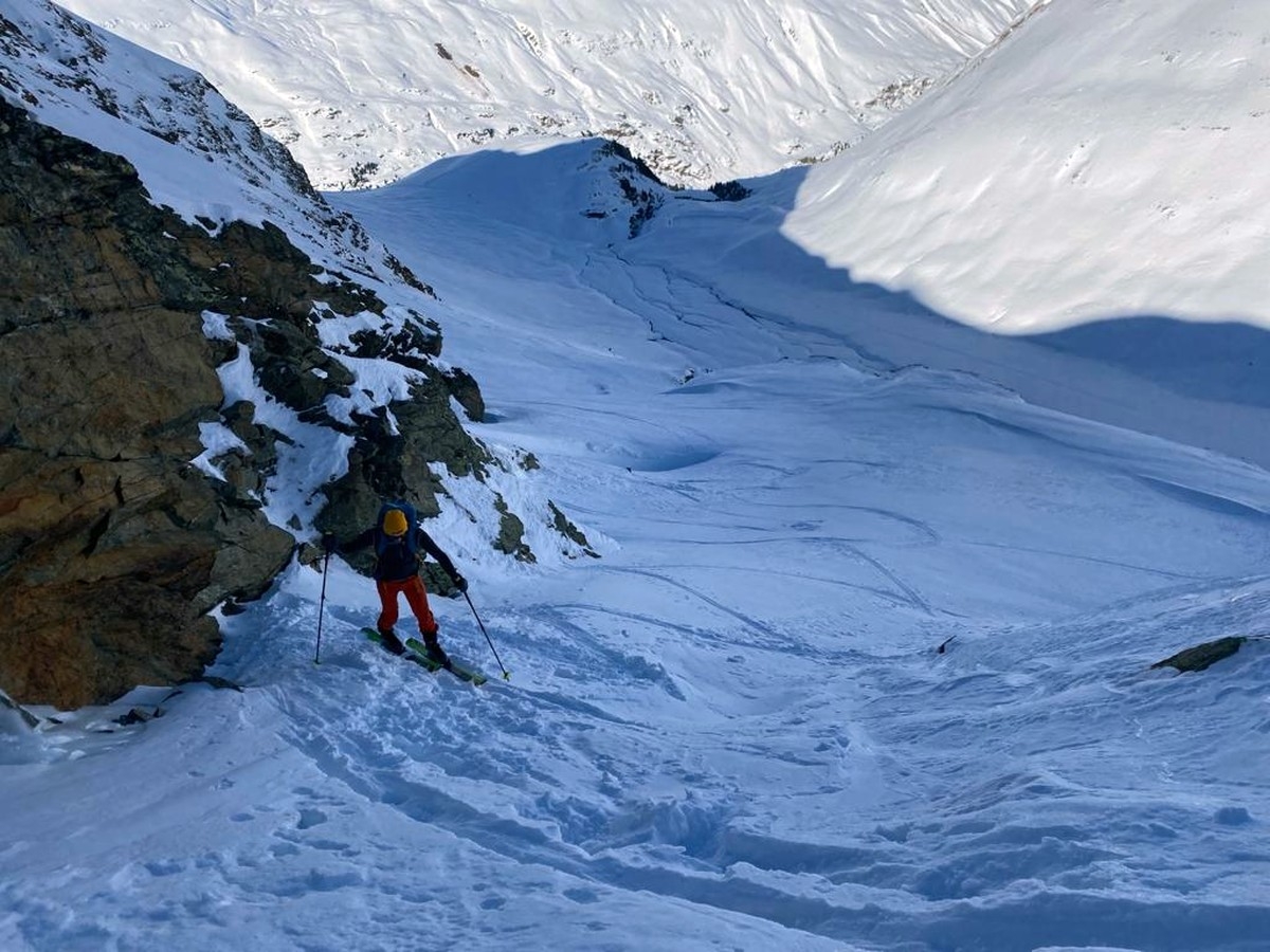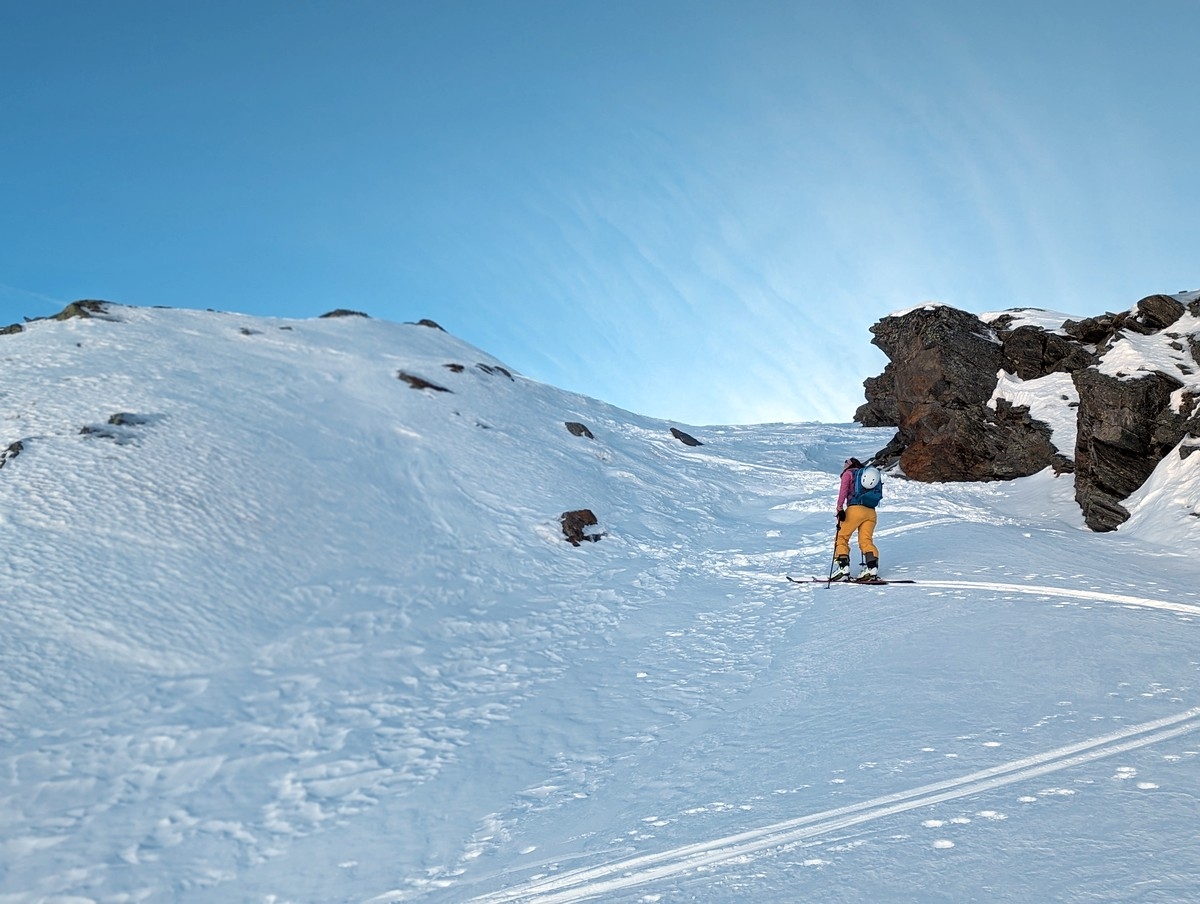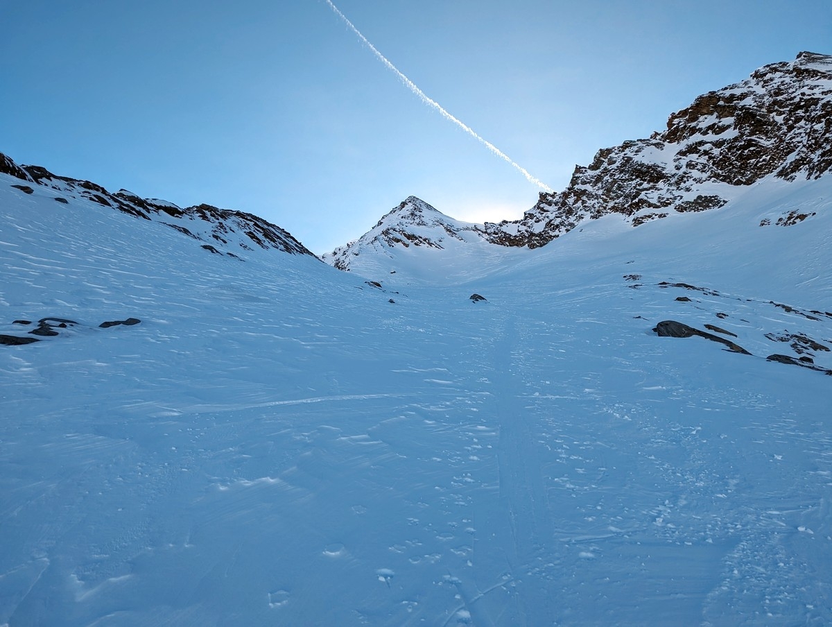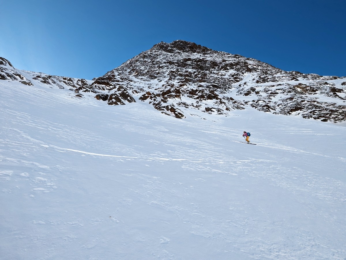 In der Abfahrt ist die Steilrinne direkt nach dem Gipfel die Schlüsselstelle. Der restliche Abschnitt ist flach und angenehm zu fahren.