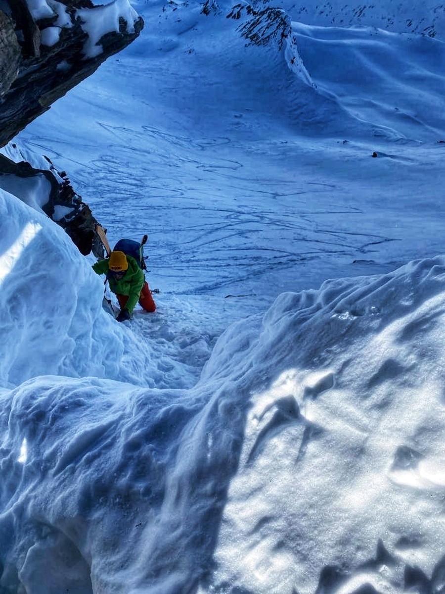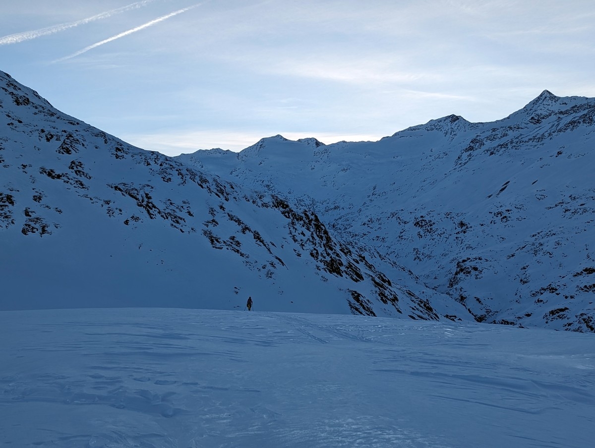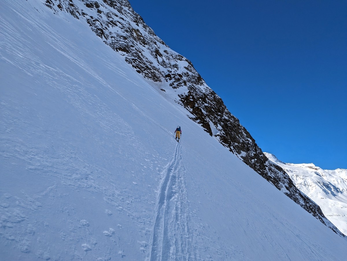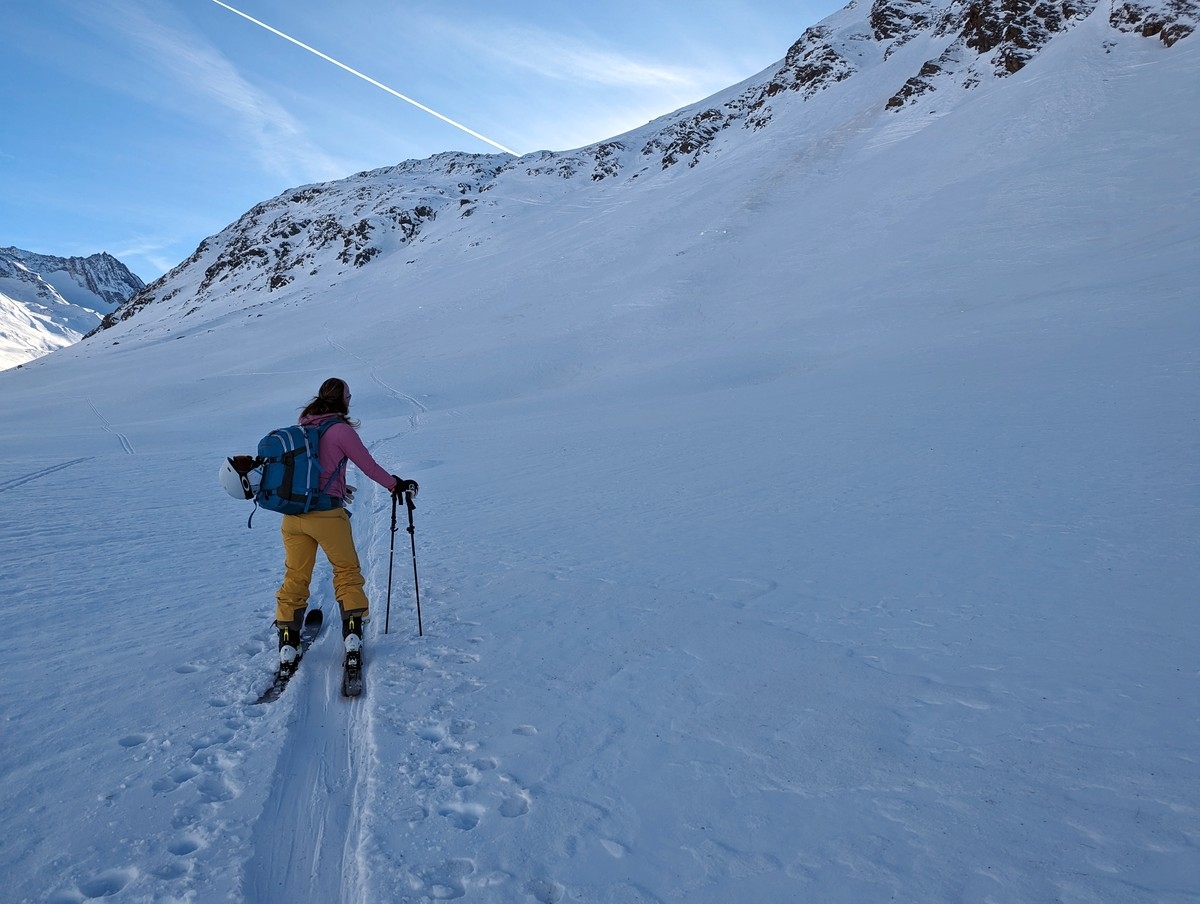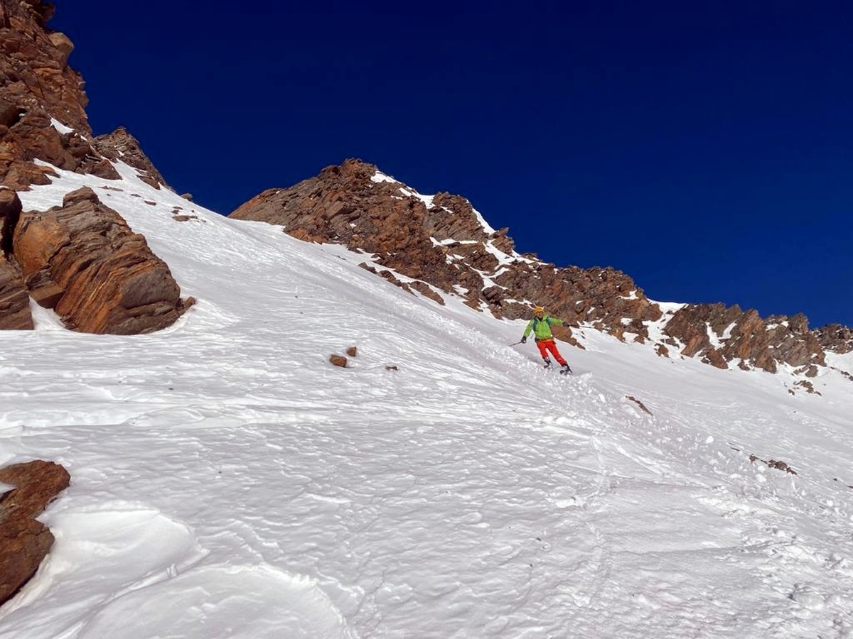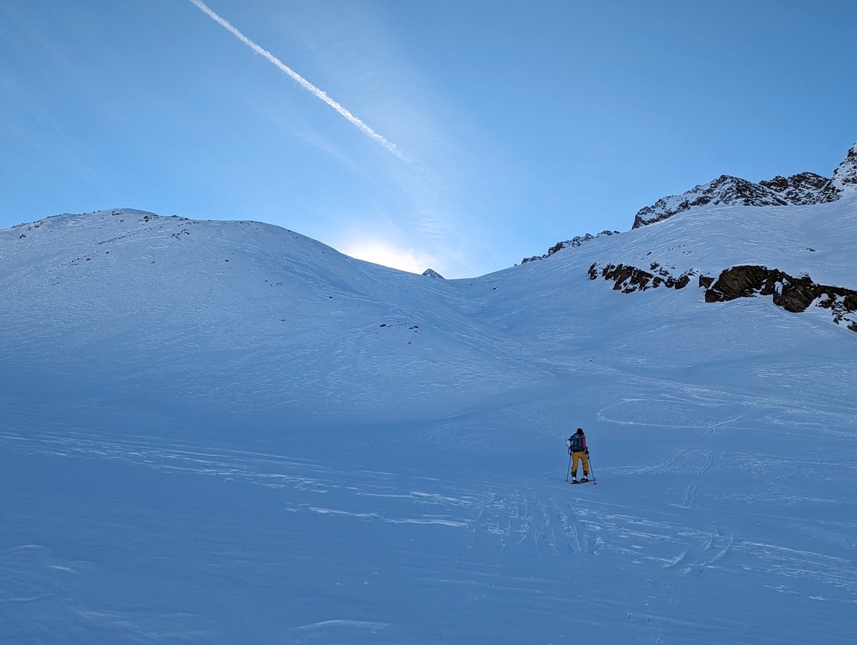 In der Abfahrt ist die Steilrinne direkt nach dem Gipfel die Schlüsselstelle. Der restliche Abschnitt ist flach und angenehm zu fahren.