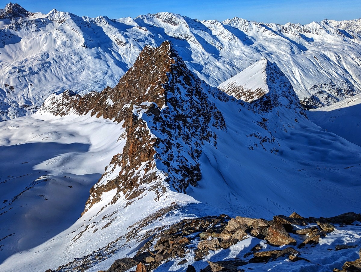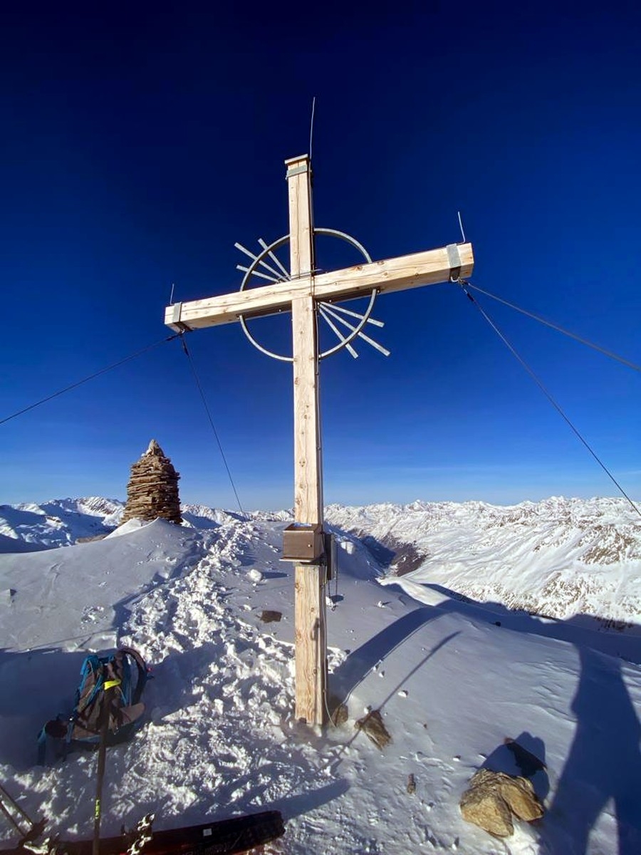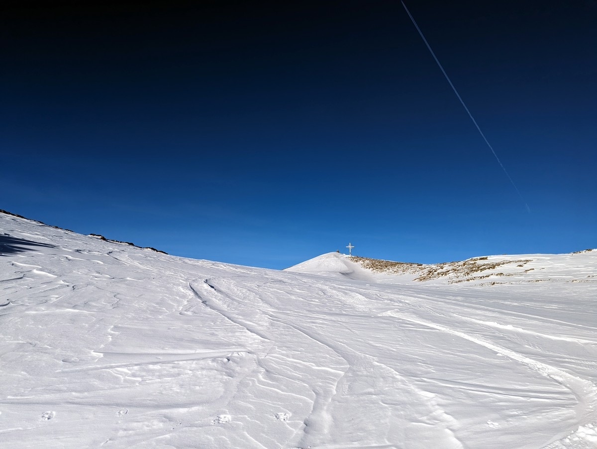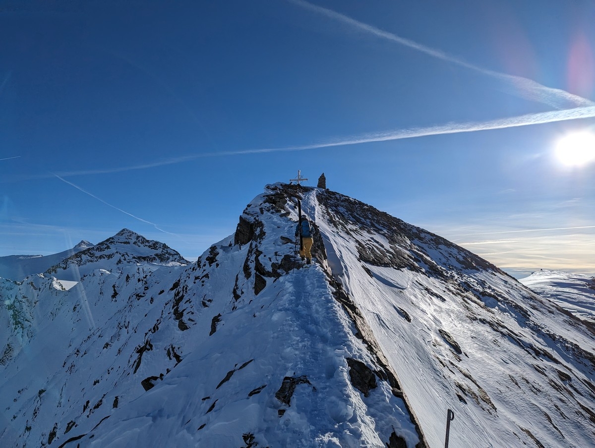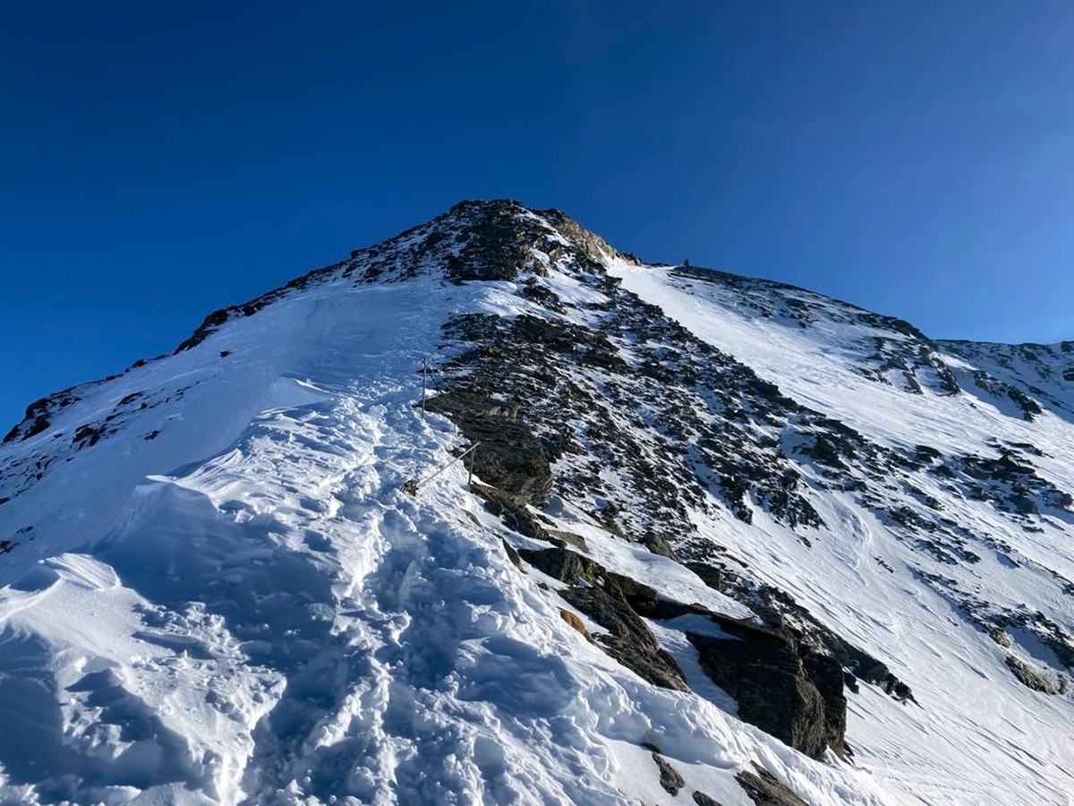 - Am Grat im stellenweise anspruchsvollen Gehgelände bis zum Gipfel wandern. Bei sehr viel Schnee ist unter Umständen sogar ein direkter Aufstieg mit den Skiern bis zum Gipfel möglich.