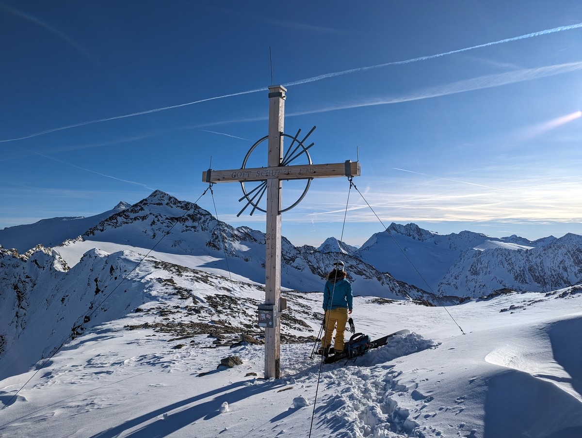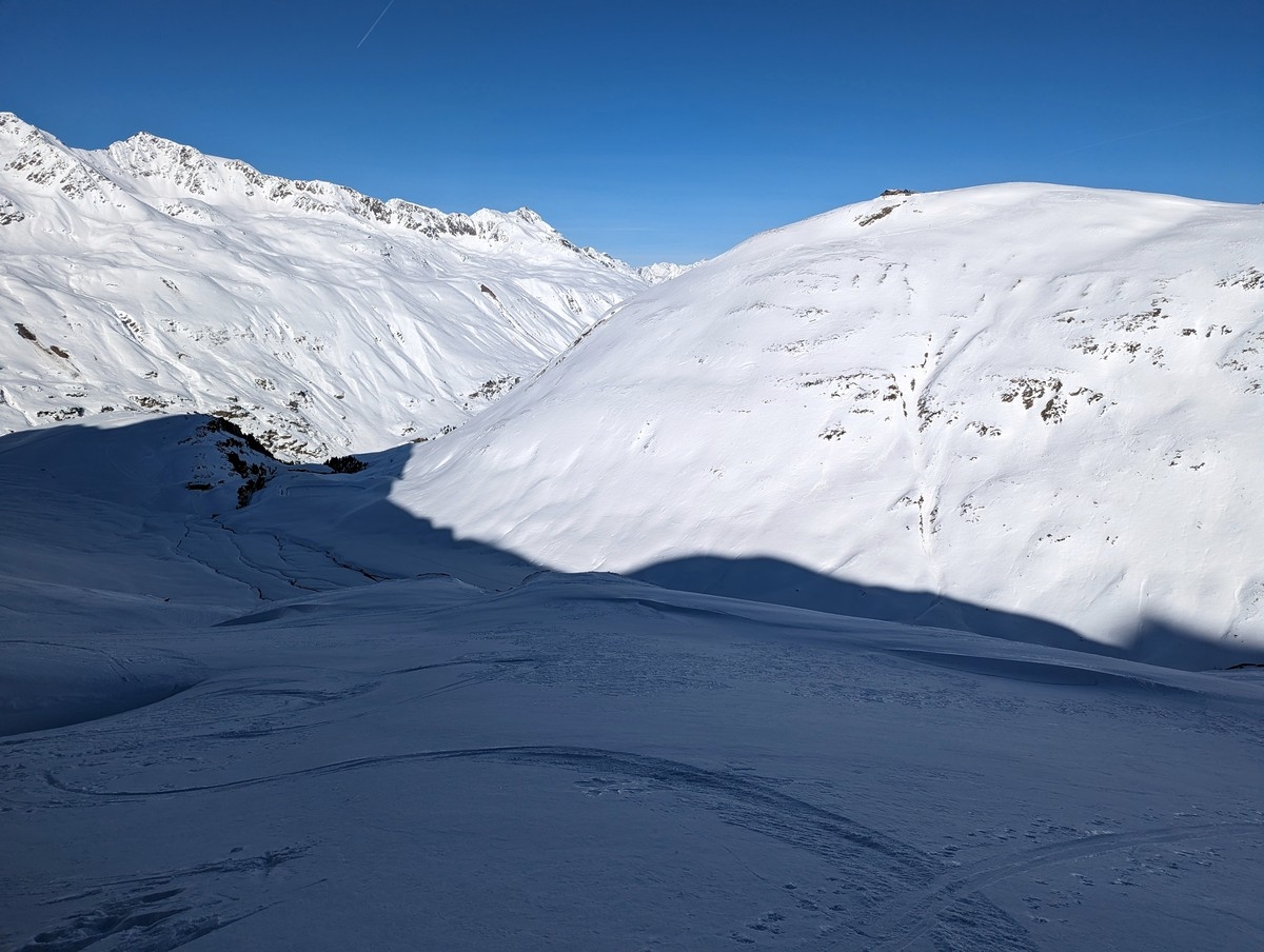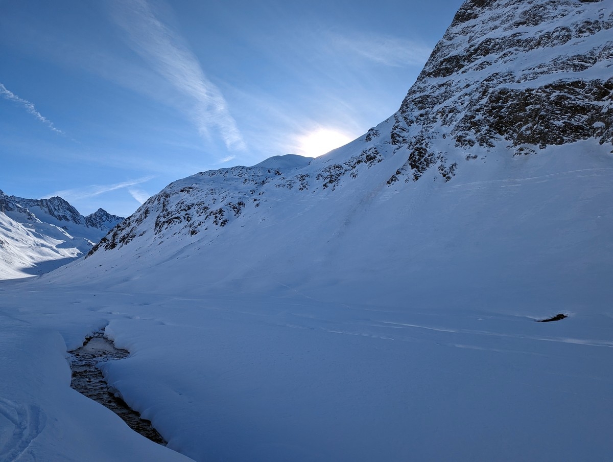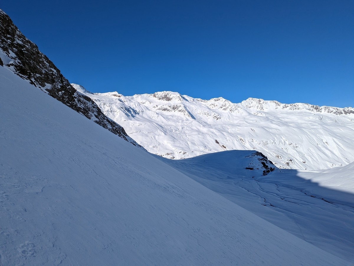 - Vom Eiskögele-Gipfel wandert man normalerweise am Grat nun zurück, um dann von der Scharte west- oder nordseitig abzufahren. Allerdings gibt es eine deutlich spannendere Option. Dazu werden die Ski direkt am Gipfel angeschnallt und im flachen Terrain kurz Richtung Südwesten gefahren, bis eine steile Rinne (40 - 45°) erreicht wird.