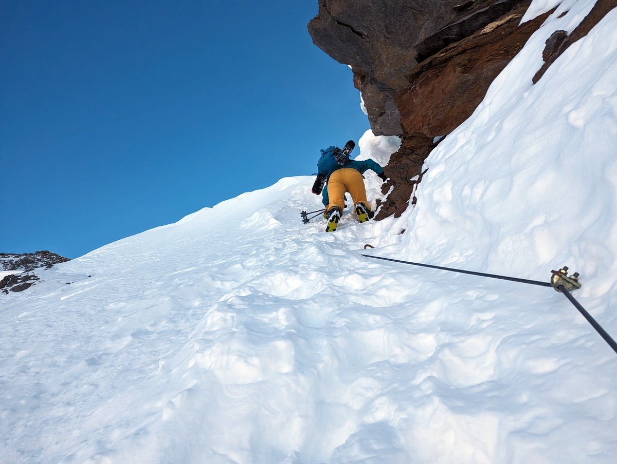 - Kurz vor dem Grat werden die Ski abgeschnallt und über einen seilversicherten Steig mit Tritten zum Grat aufgestiegen. Der Abschnitt kann, je nach Bedingungen, heikel sein. Steigeisen oder Harscheisen werden "eher" nicht benötigt, könnten aber, je nach Bedingungen, durchaus hilfreich sein.