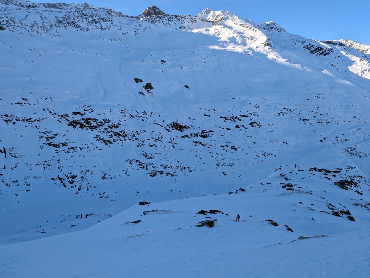 - Der Steilhang sieht von der Weite steiler aus als er es tatsächlich ist, kann aber mitunter durchaus lawinengefährdet sein.