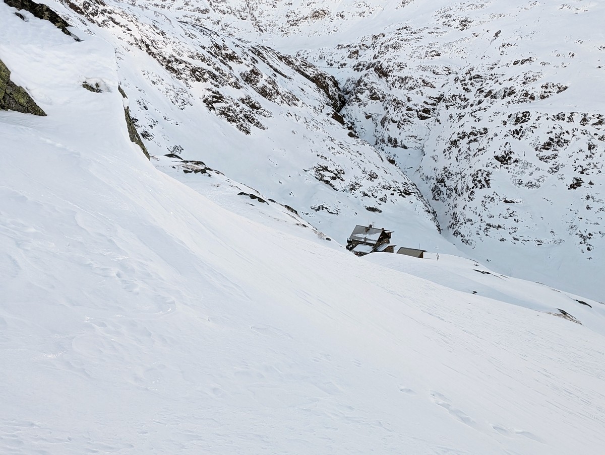 - Die Rinne ist nur sehr kurz (siehe Fotos), sollte aber nicht unterschätzt werden. Nach der Rinne folgt nun eine sehr lange Querung nach rechts, bis wieder die Originalroute der westseitigen Abfahrt erreicht wird. Von dort Richtung Langtalereckhütte, aber nicht ganz bis zur Hütte bergab fahren (Ausnahme: Einkehr), sondern rechts halten und zur Materialseilbahn fahren.