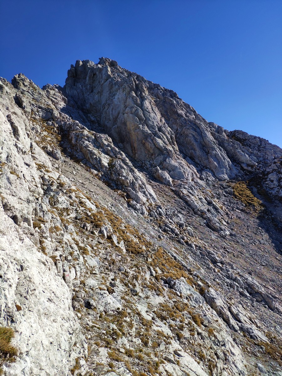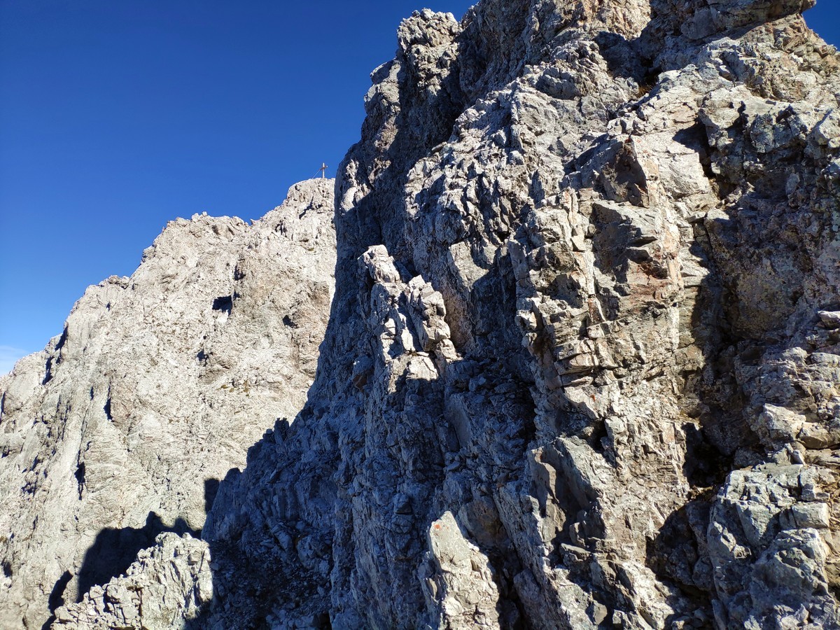 - Der Schlussabschnitt auf die Gabelspitze enthält einige Kletterstellen bis UIAA 2. Der letzte Abschnitt am Grat kann auch rechts umgangen werden (Steinmänner, aber leicht brüchig), direkt über den Grat ebenfalls möglich (keine Steinmänner).