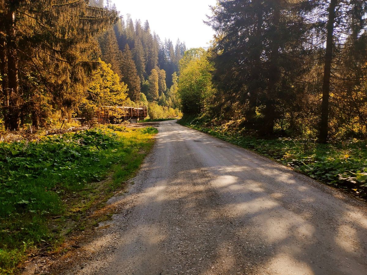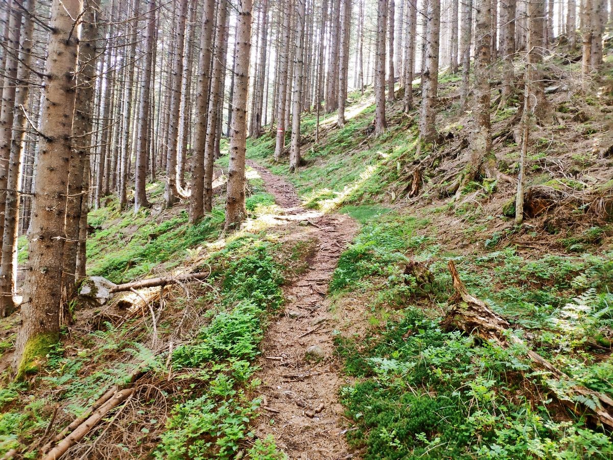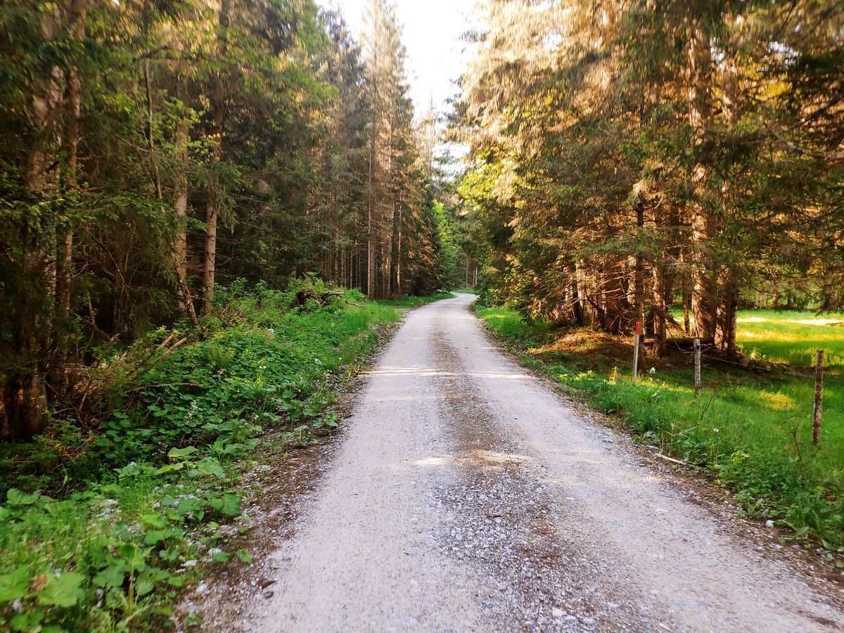 - Die Route führt nun kurz über einen Pfad durch den Wald und dann länger dem Forstweg entlang.