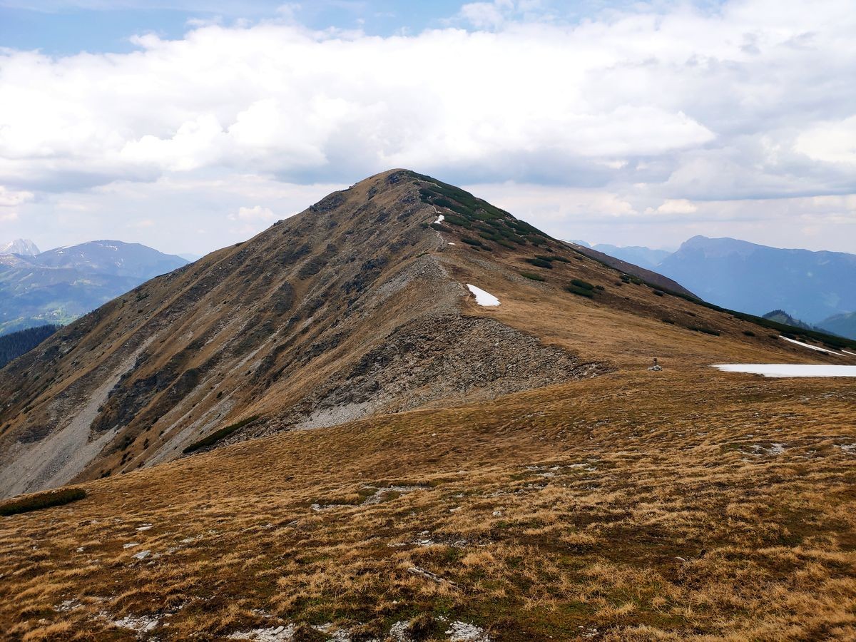 - Nun weiter Richtung Feistererhorn. Zwischen Kleinem Reichhart und Feistererhorn kann bei Müdigkeit der direkte Abstieg zur Schönebenalm genommen werden oder mit dem Feistererhorn (2.081 m) noch der letzte Gipfel der Tour anvisiert werden.