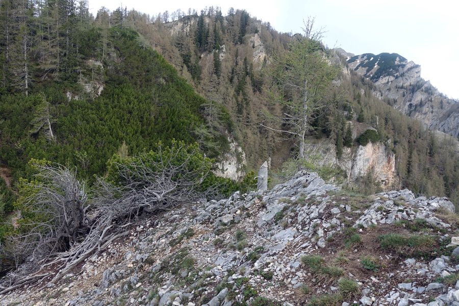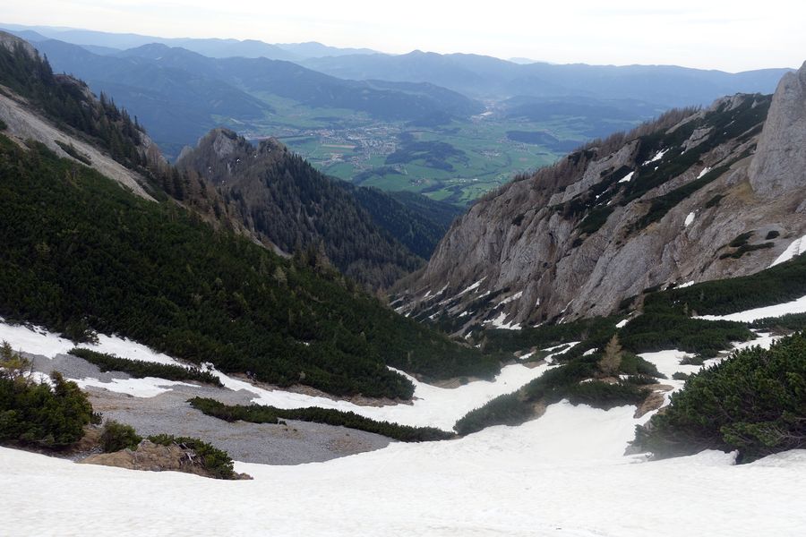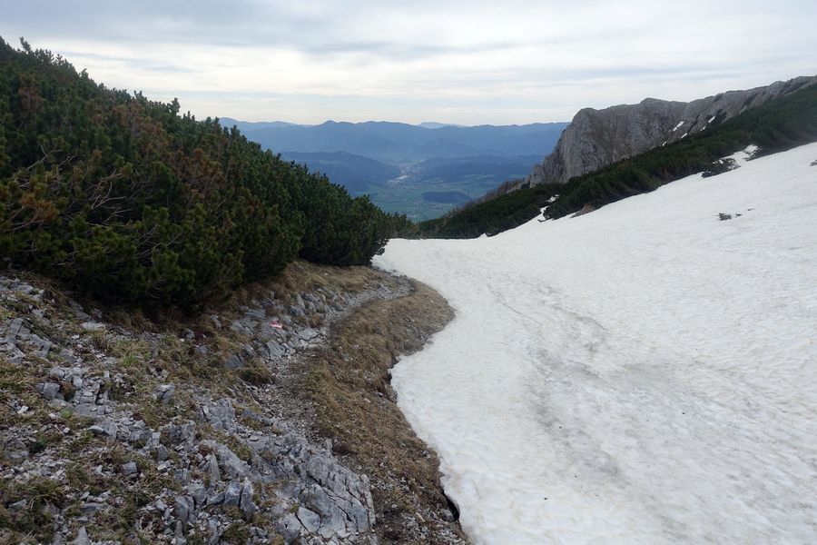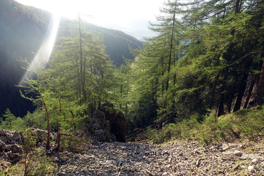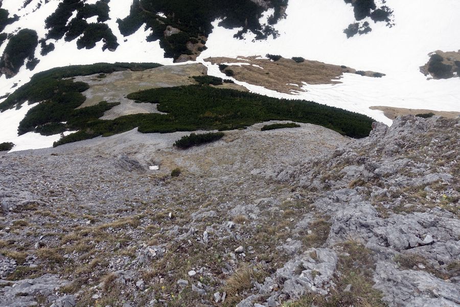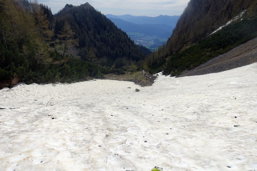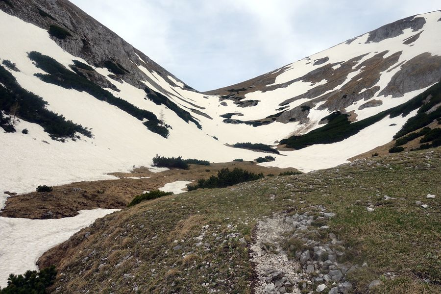 Bergab geht es das erste Stück wieder auf gleichem Wege retour, ehe man bei der Beschilderung nun Weg 693 in den Bechlgraben folgt. Auf diesem geht es in Kehren und Schotterfeldern auf durchgehend markierten Pfaden bergab ins Tal. Teilweise gibt es hier auch im Spätfrühling noch das eine oder andere Schneefeld.
