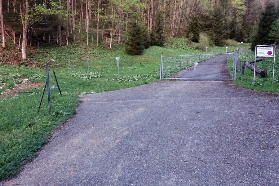 Die Tour umfasst etwa 1.300 - 1.400 Höhenmeter und kann bei normalem Tempo (Pausen nicht miteingerechnet) in sechs Stunden bewältigt werden. Am Parkplatz Gößeck ist eine (freiwillige) Gebühr von einem Euro zu zahlen. Danach folgt man sofort links der Forstraße, ehe man zum Wasserschutzgebiet kommt. Dort führt der Weg links in den Wald. Nun trennen sich bei einem Wegweiser Auf- und Abstiegsweg. Rechts geht es zum Bechlgraben und links führt der nicht markierte Aufstiegsweg Richtung Gipfel. Die rechte Route ist wahrscheinlich etwas kürzer bis zum Gipfel. Da aber etwas Abwechslung gut tut, wähle ich für den Aufstieg den linken Weg, der lange durch den Wald führt. Nach den ersten Minuten im Wald erreicht man einen Zaun, denn man mittels Überstieg überquert. Danach folgt man halblinks dem Pfad. Nun hält man sich immer leicht rechts bergauf. Nach einiger Zeit passiert man ein Jagdhaus, ehe sich der Wald lichtet und sich erstmals auf rechter Seite ein Blick auf den Gipfel bietet. Nun geht es weiter halbrechts bergauf, ehe sich etwa hundert Höhenmeter vor dem Gipfel Auf- und Abstiegsweg treffen. Das letzte Stück führt noch einmal auf angenehmen Wege bergauf.