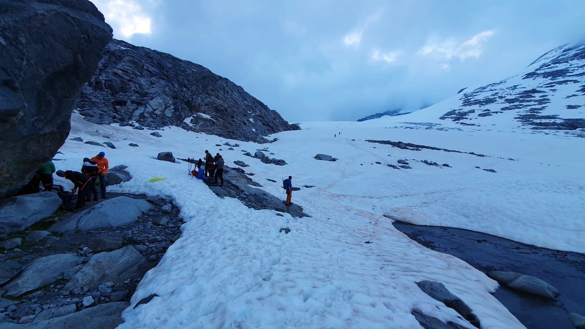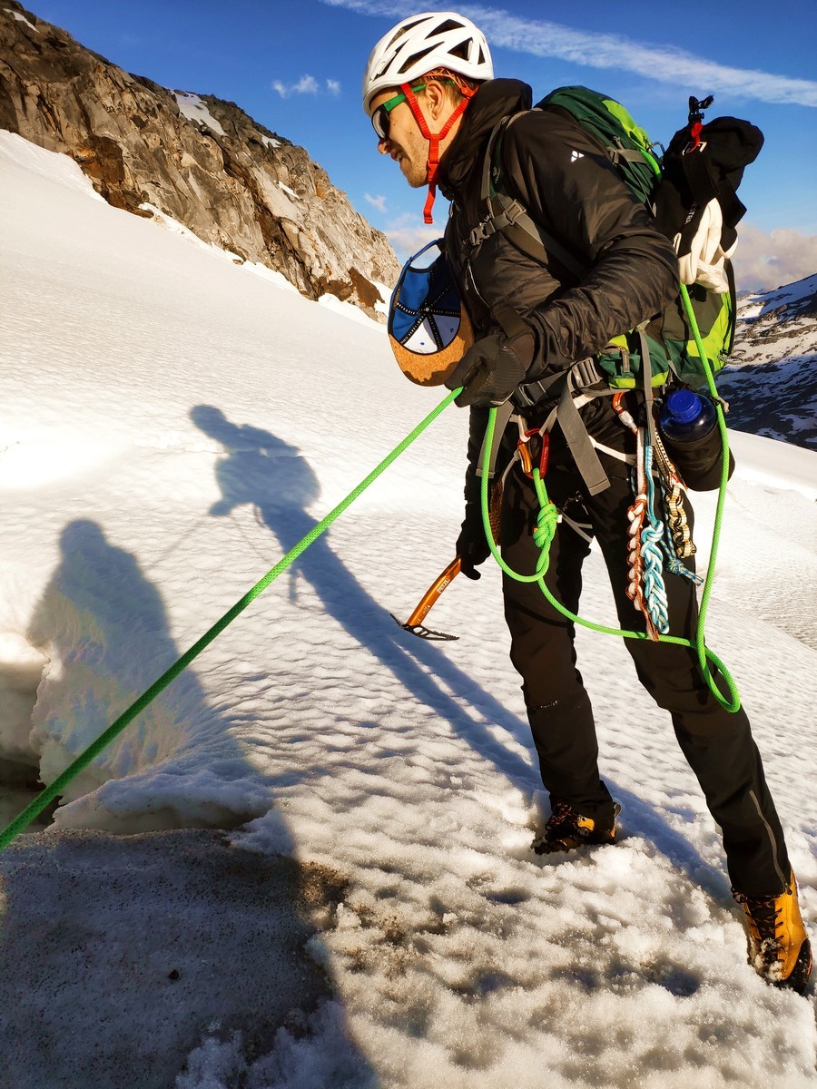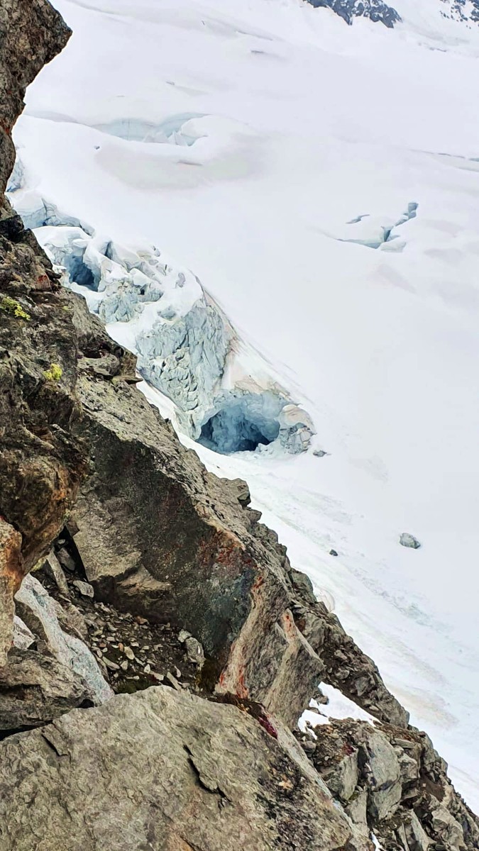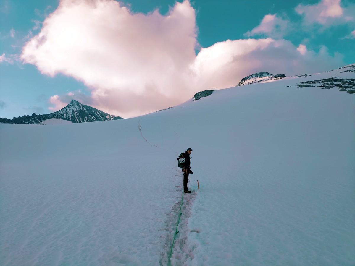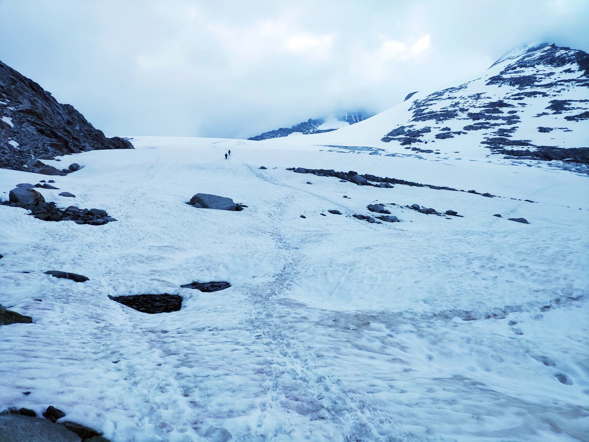 - Kurz vor dem Gletscherbeginn leicht absteigen. Danach anseilen und Einstieg in den Gletscher-Normalweg.