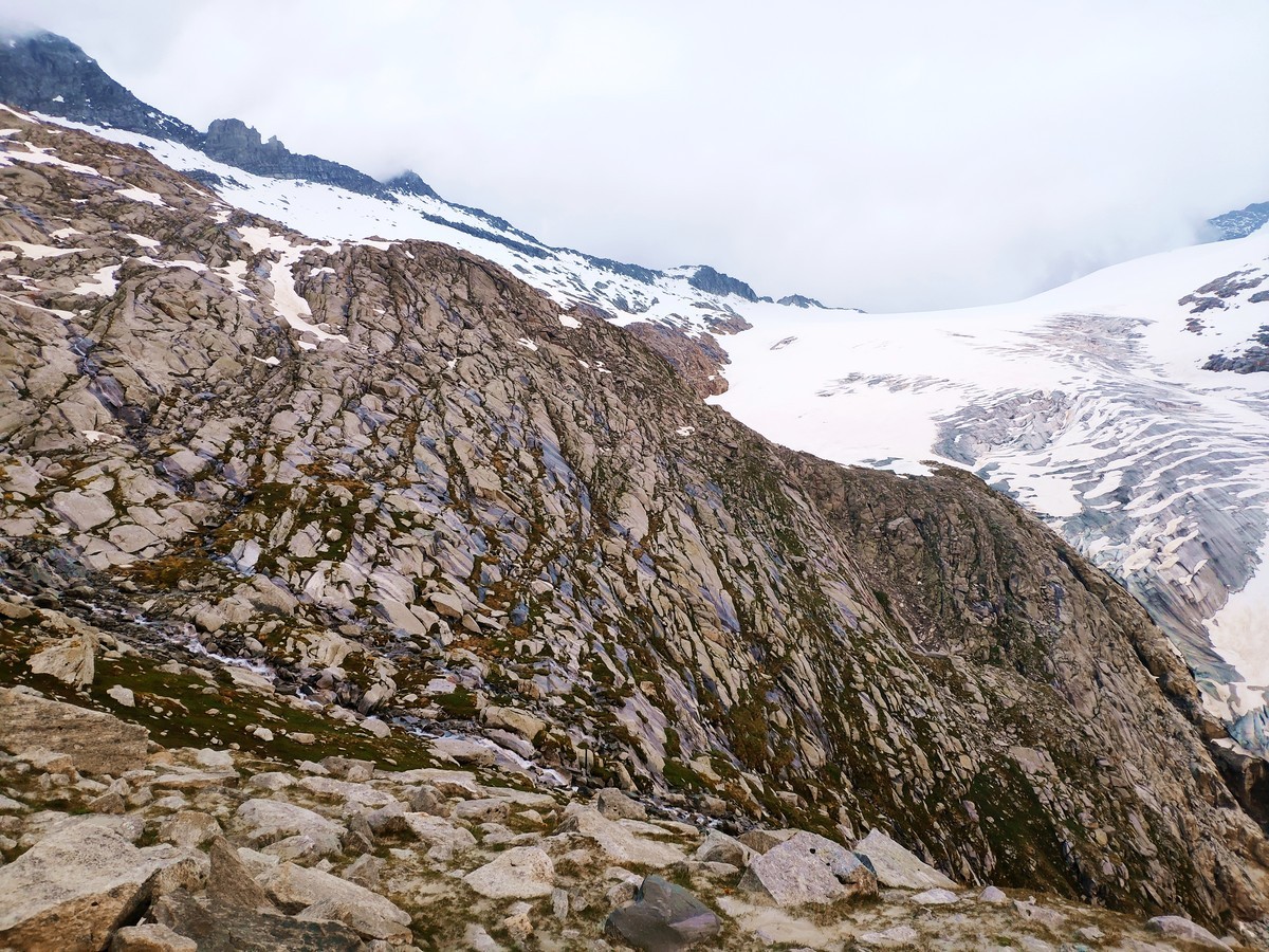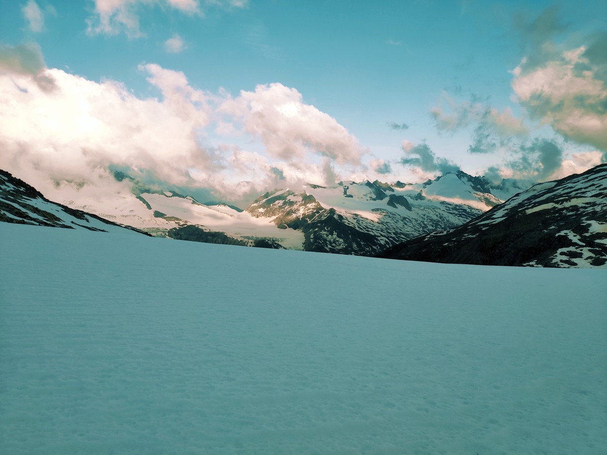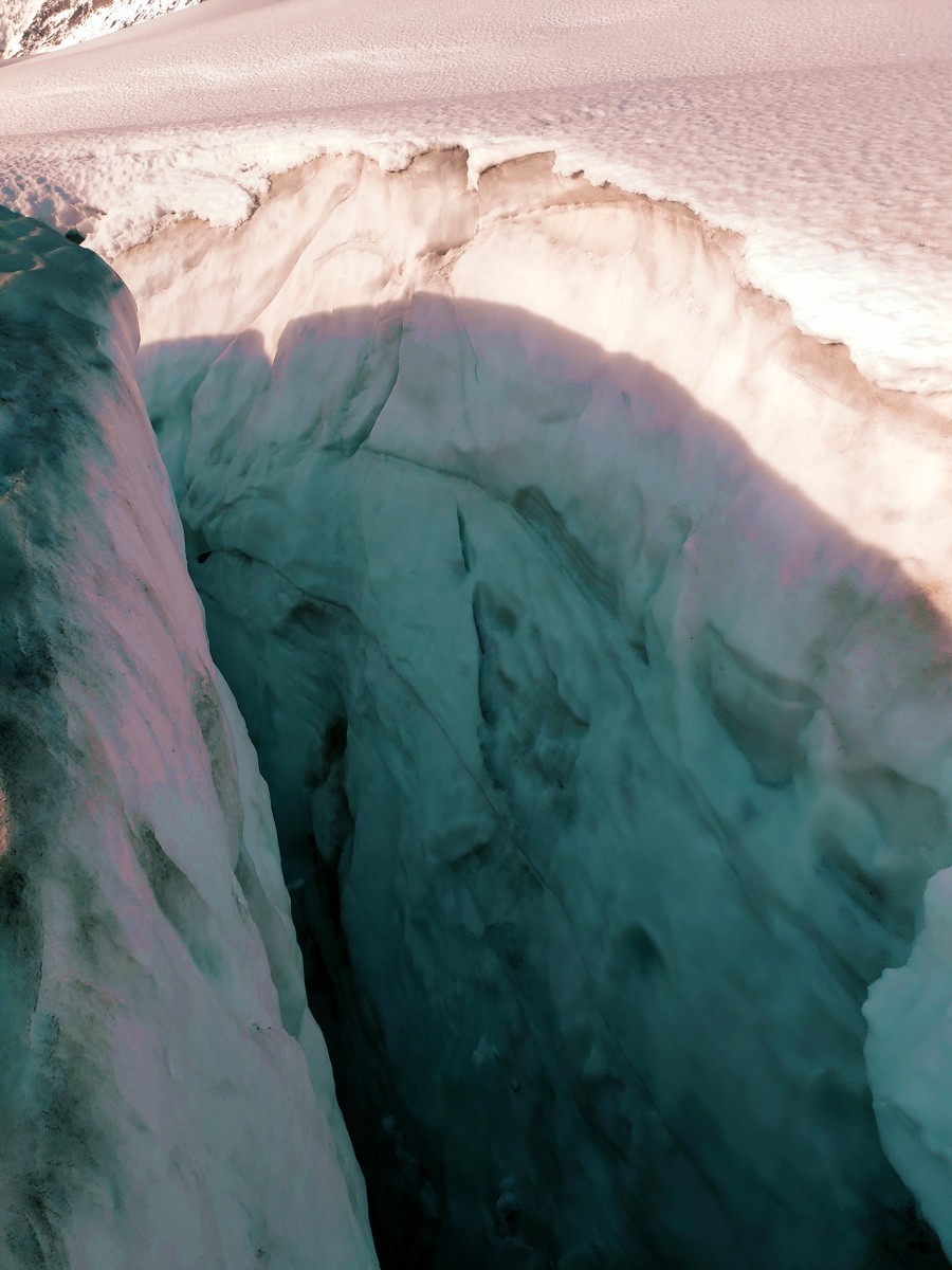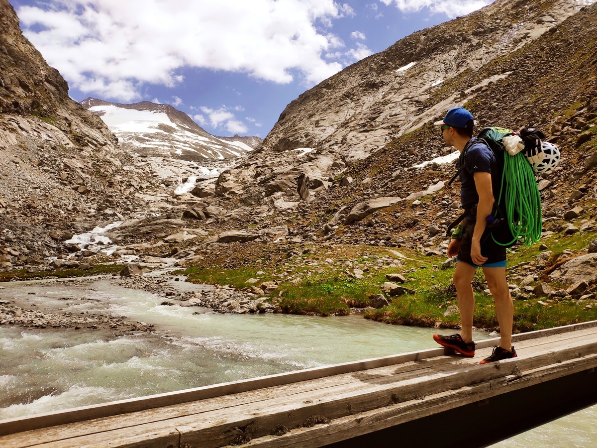 - Kurz vor dem Gletscherbeginn leicht absteigen. Danach anseilen und Einstieg in den Gletscher-Normalweg.
