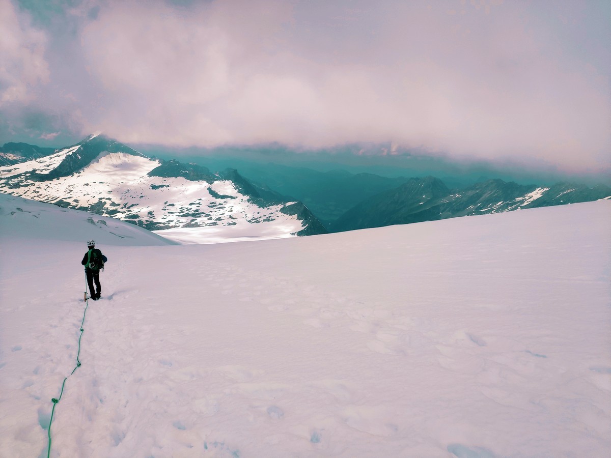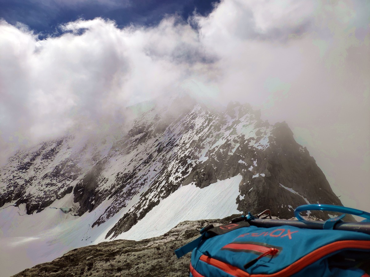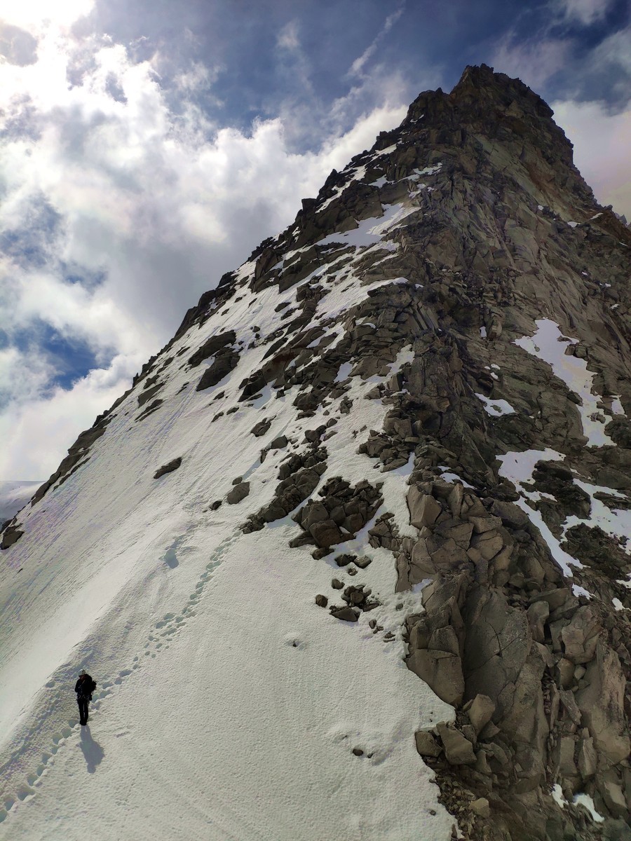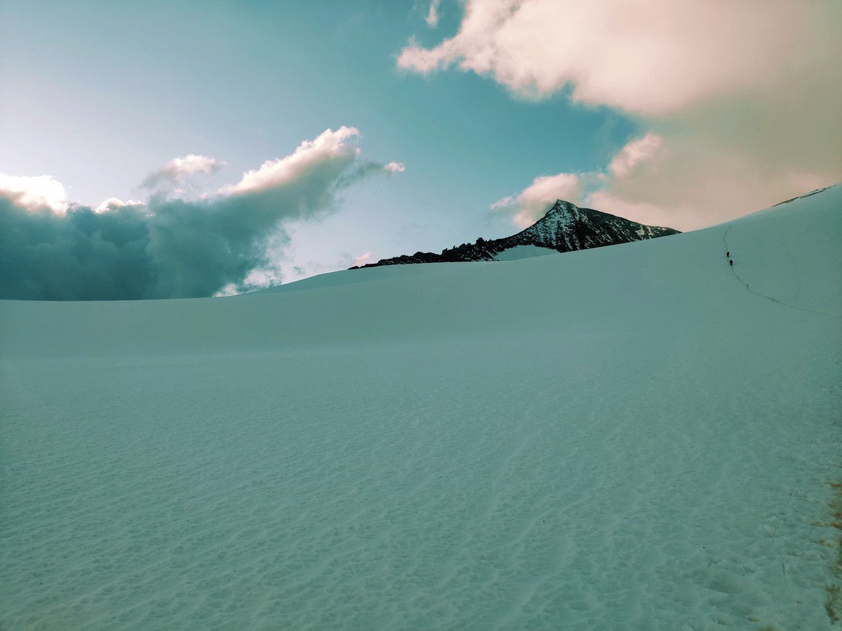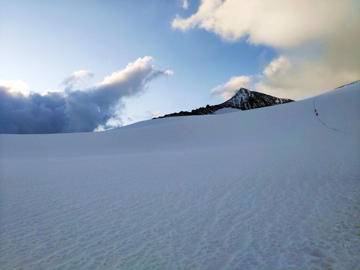 - Zu Beginn des Gletschers für kurze Zeit weiterhin dem Normalweg folgen und danach rechts auf den Beginn des Nordgrats queren.