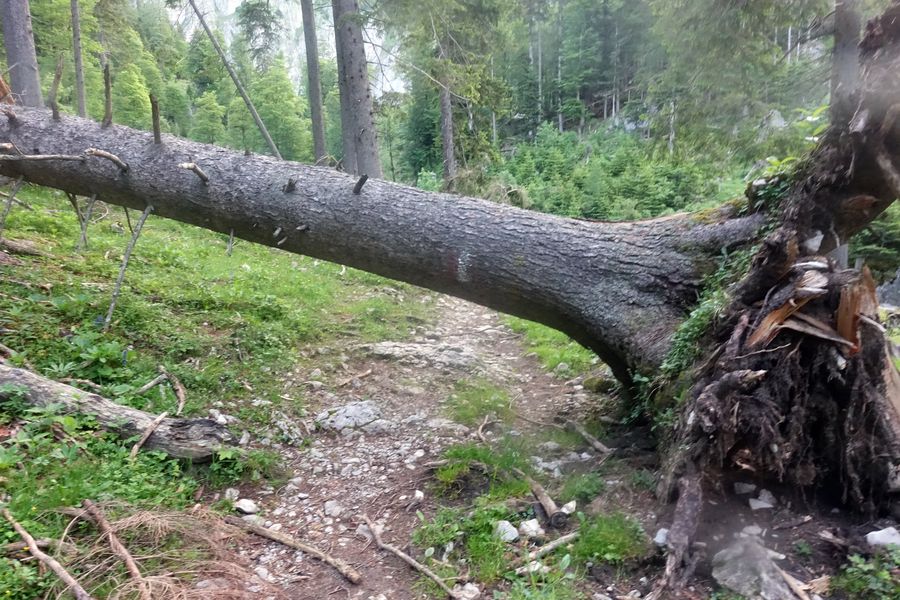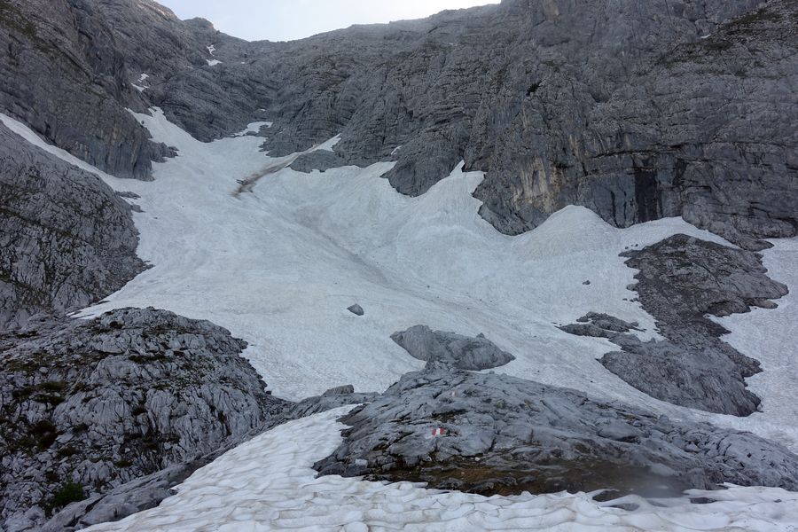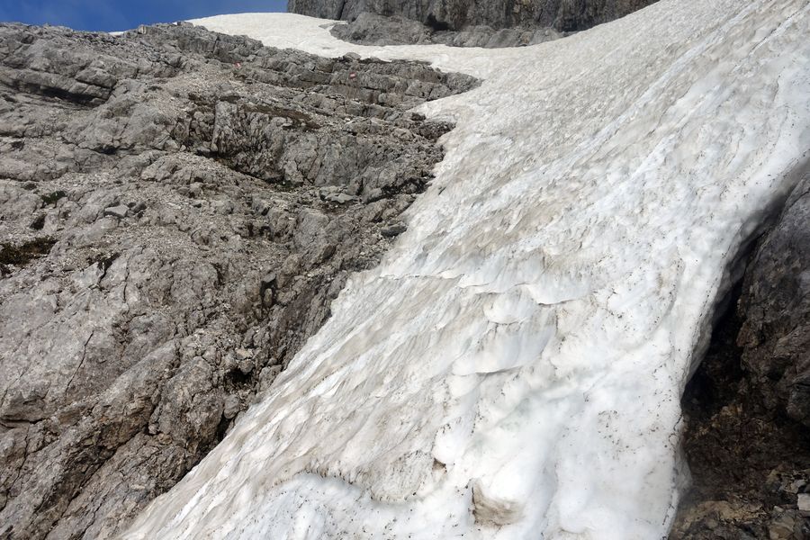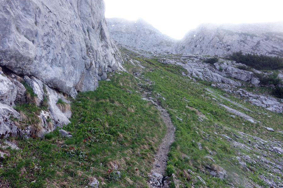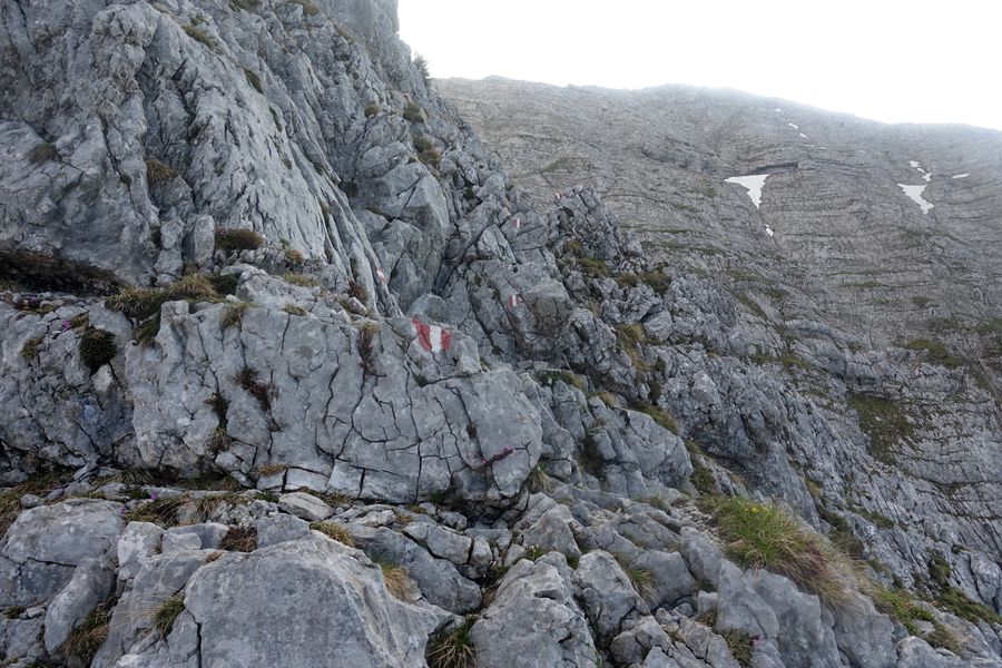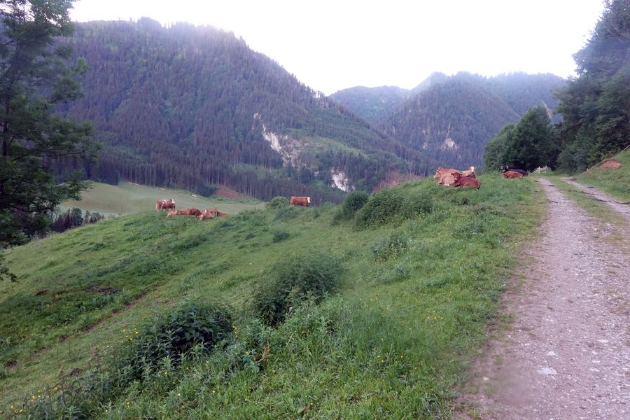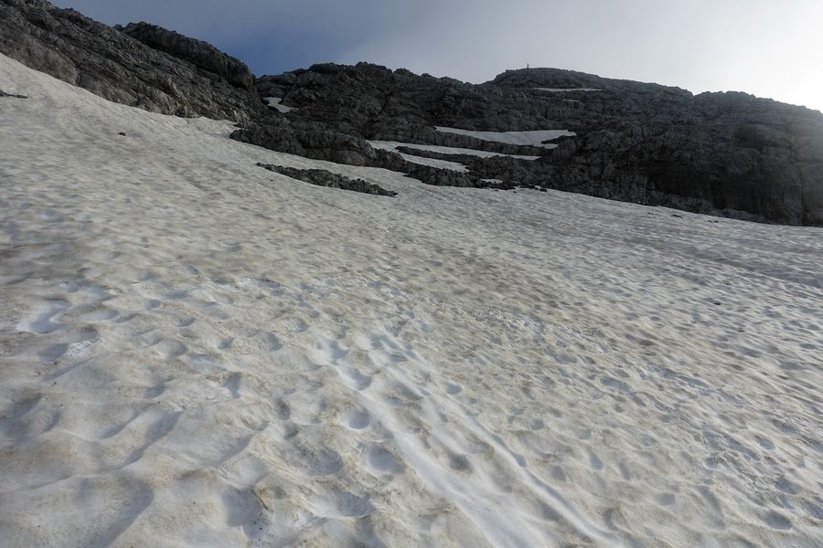 Nach dem Start beim Köblwirt in Johnsbach führt die Route anfangs durch Wiesen und Wälder an Kühen vorbei, bis man zur Abzweigung kommt, an der sich der Schneelochsteig vom Josefinensteig trennt. Nun geht es links dem Schneelochsteig entlang, auf dem sich nun sanfte Waldwanderwege langsam aber doch in Felsen und Geröll wandeln. Ziemlich früh führt die Route auch über die ersten Altschneefelder, die sich meist auch den gesamten Sommer halten - daher auch der Name Schneelochsteig. Meist hält man sich dabei links. Die Route ist allerdings durchgehend hervorragend markiert. Ein Verlaufen ist trotz Schneefelder nahezu unmöglich. Danach geht es über Serpentinen und Felsbänder (Schwierigkeit I bis I+) Meter für Meter Richtung Gipfel. Die Kletterpassagen sollten auch für Einsteiger keine unüberwindbaren Herausforderungen darstellen, erfordern aber Trittsicherheit und Konzentration.