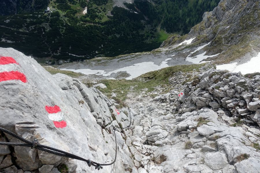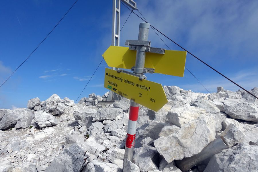 Ist der Gipfel des Hochtors erreicht, geht es nun über den markierten Josefinensteig bergab zur Hesshütte. Der luftige Abstieg (anfangs über den Grat) ist an den anspruchsvollen Stellen mit Drahtseilen versichert. Schwindlfreiheit ist aber auf diesem Abstieg ein absolutes Muss. Erst auf den letzten Metern Richtung Hesshütte wird es wieder gemütlich. Nun folgt auch der angenehmste Teil der Tour.