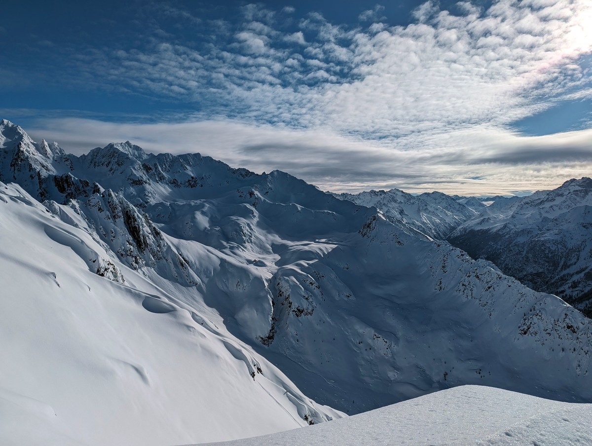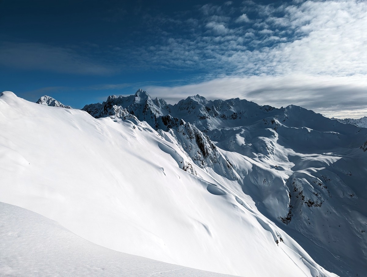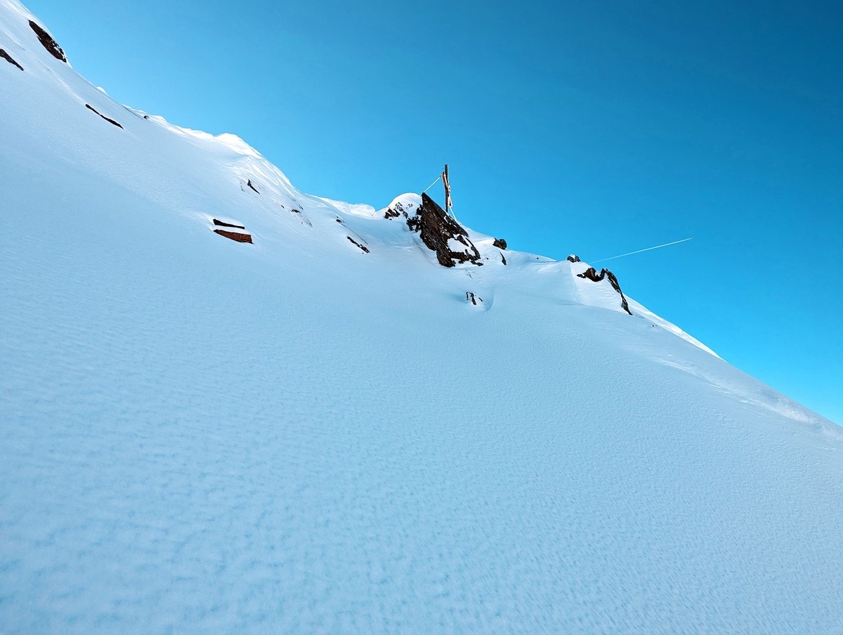 Der Gipfelhang ist steil und kann je nach Bedingungen durchaus anspruchsvoll sein. Ich habe damals den Hang gespurt und für die letzten fünf Höhenmeter gefühlt eine halbe Stunde benötigt. Ist aber erst mal gespurt, sollte die Schwierigkeit deutlich reduziert sein.