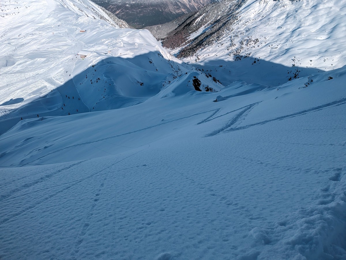 - Zunächst ist der Hang noch etwas flach, im Schlussabschnitt nimmt die Neigung aber zunehmend zu. Gute Spitzkehrentechnik ist dann von Vorteil.