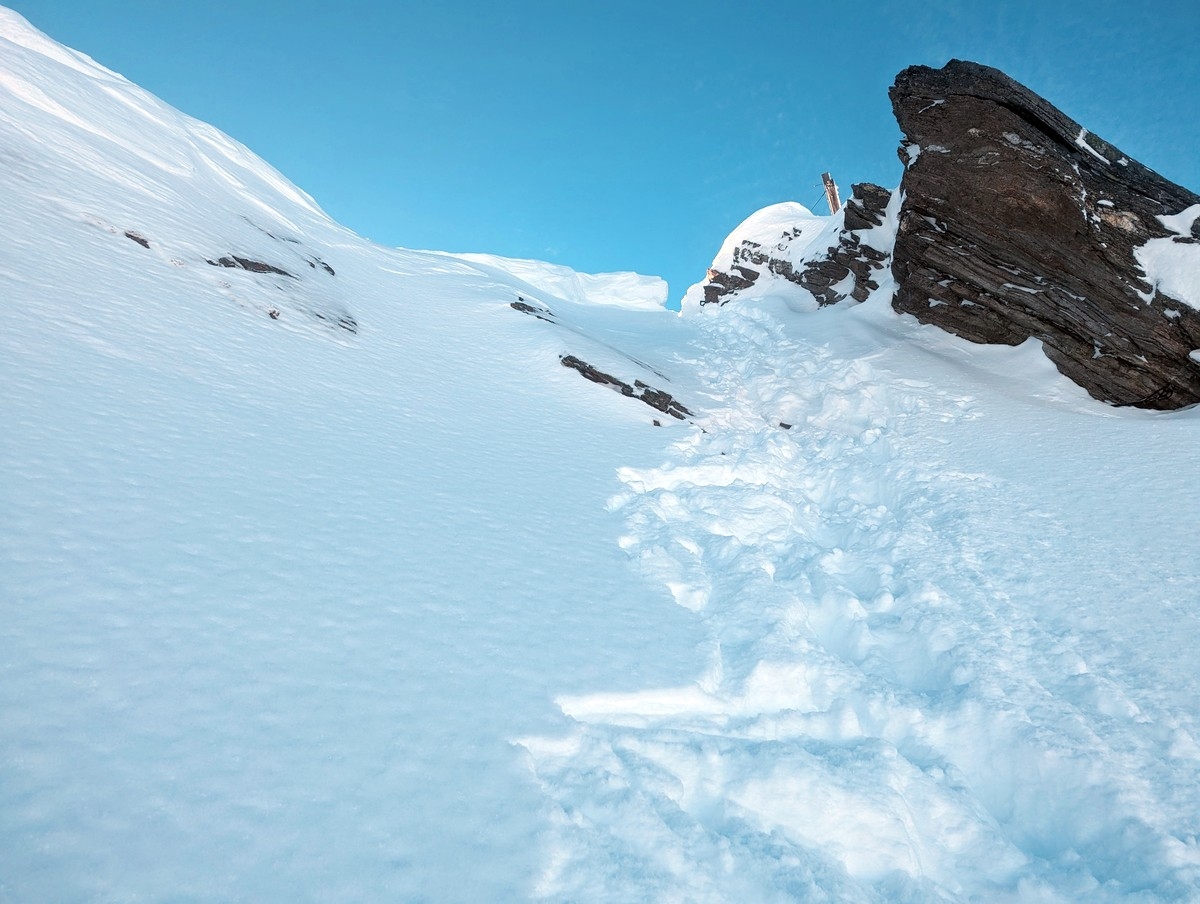 - Auf den letzten Metern gibt es eine Seilversicherung, die im Winter wohl zumeist unterhalb des Schnees festsitzt. Demnach können vor allem die letzten Meter im steilen Gelände sehr anspruchsvoll sein. Vor allem bei wenig Schnee, da dann durch den Felskontakt kaum noch Halt vorhanden ist. Wenn gespurt ist, sollte der Abschnitt aber um einiges einfacher sein.