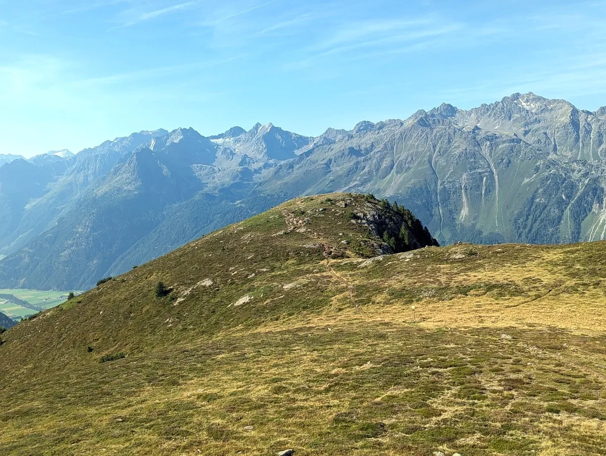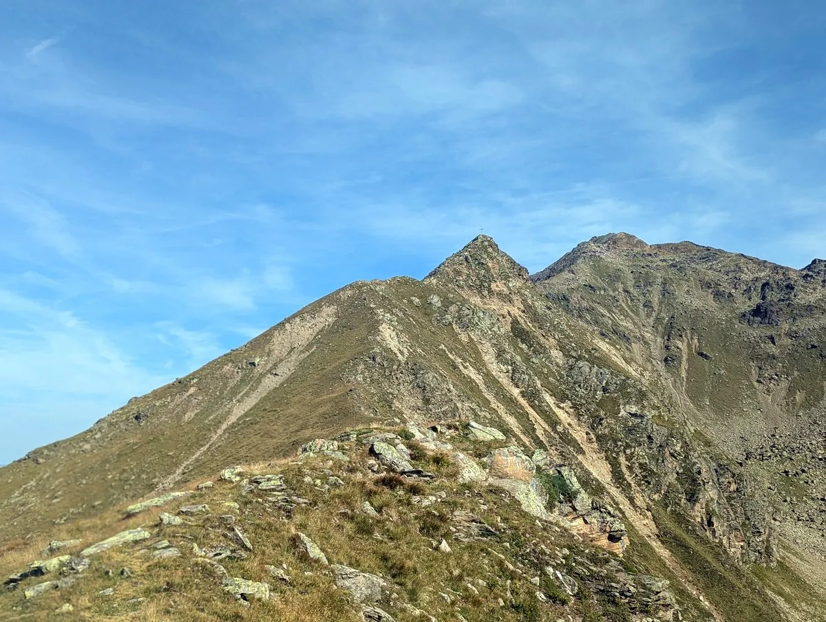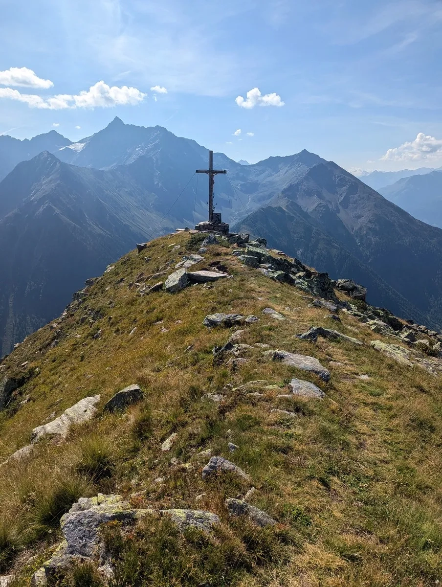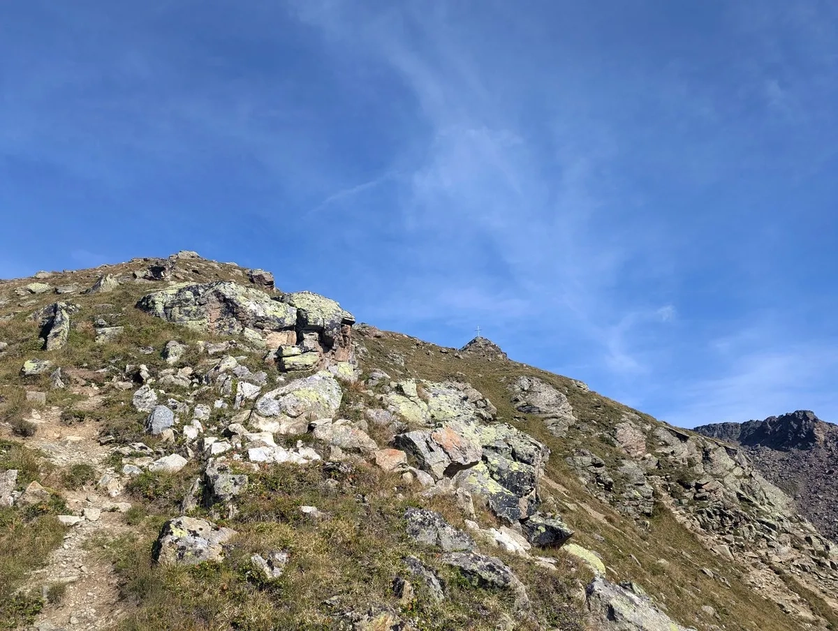 - Vom Poschachkogel aus ist bereits das Gipfelkreuz des Gruegrat im Norden zu sehen. Ein unmarkierter Pfad führt dorthin. Nach dem Gipfel wieder zurück zum Poschachkogel.