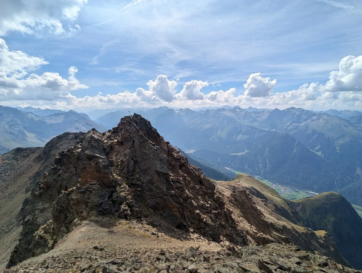- Auf ca. 2.800 Metern Höhe kann ein erster Gratabschnitt westseitig im Blockgelände umgangen werden. Der Grat ist jedoch in der Regel gut begehbar.