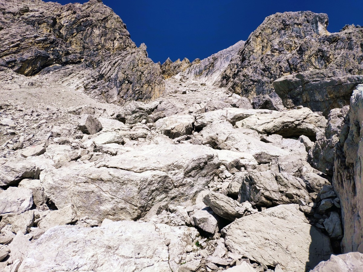 - Durch die Mittlere Schochenalp, die Hintere Schochenalp und über ein brüchiges Steinfeld auf die Kleine Steinscharte, wo sich nun der Heilbronner Weg befindet.