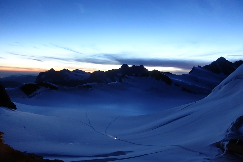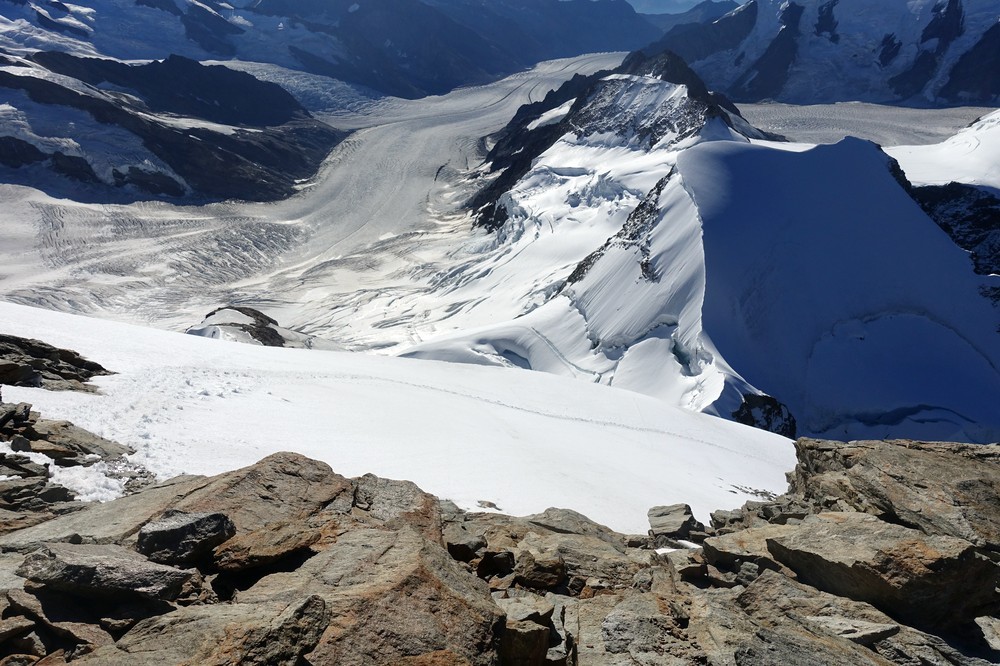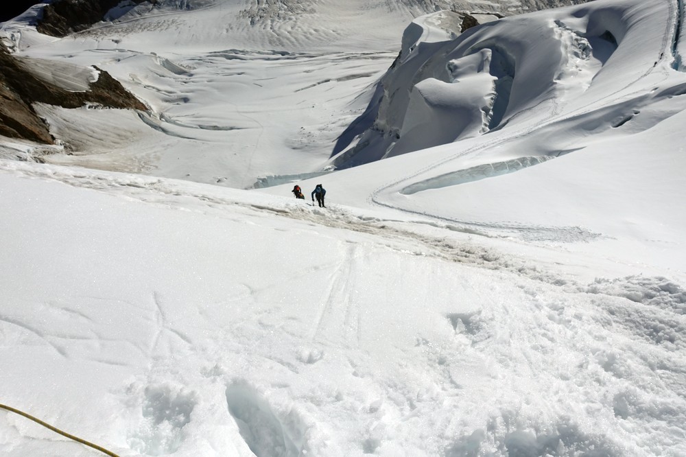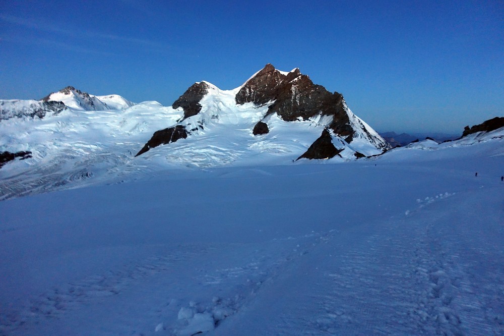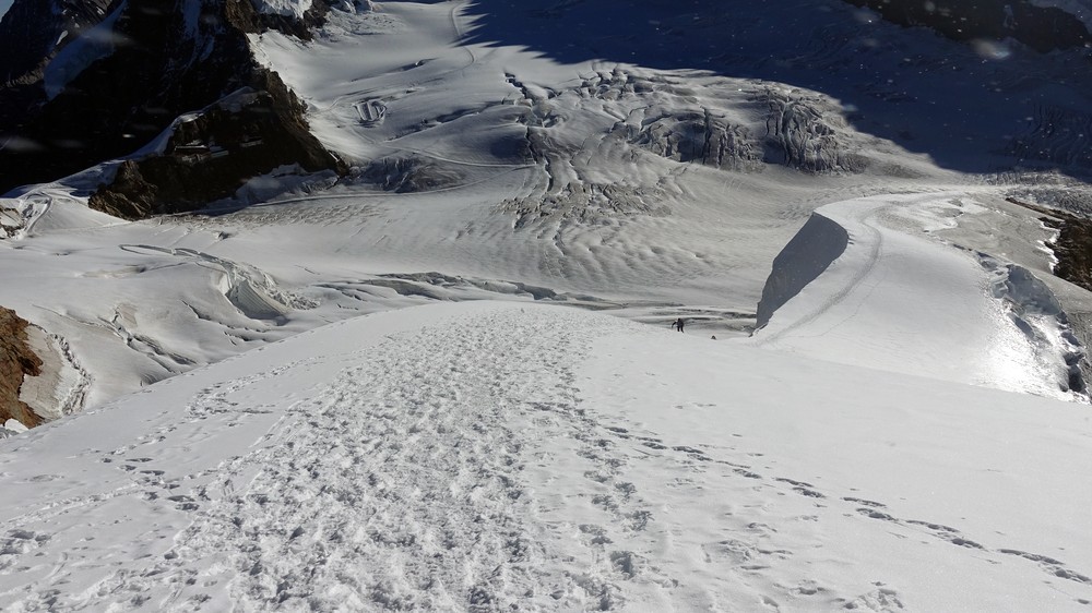 Trotz der kurzen Distanz und des geringen Höhenunterschiedes eine nicht zu unterschätzende 4000er-Hochtour mit einigen tückischen und gefährlichen Spalten, sowie kurzen Kletterabschnitten.