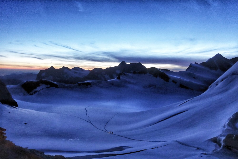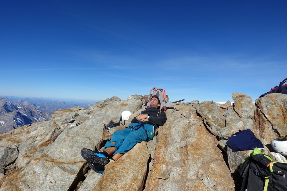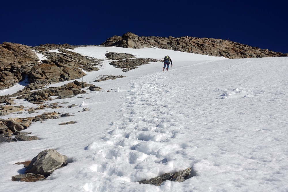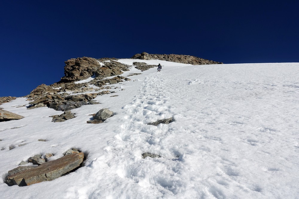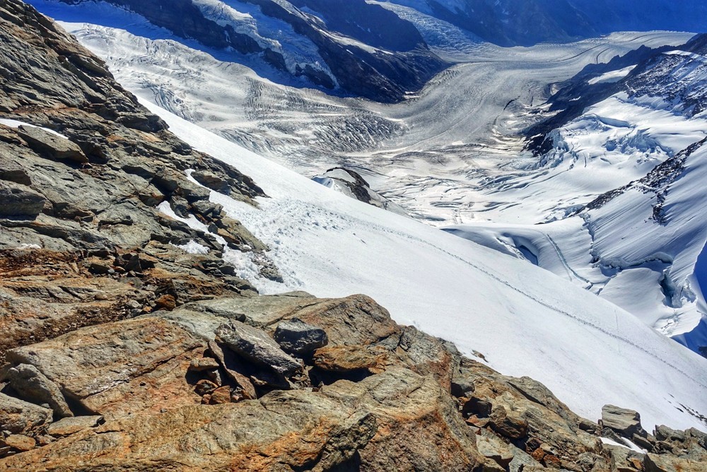 Trotz der kurzen Distanz und des geringen Höhenunterschiedes eine nicht zu unterschätzende 4000er-Hochtour mit einigen tückischen und gefährlichen Spalten, sowie kurzen Kletterabschnitten.