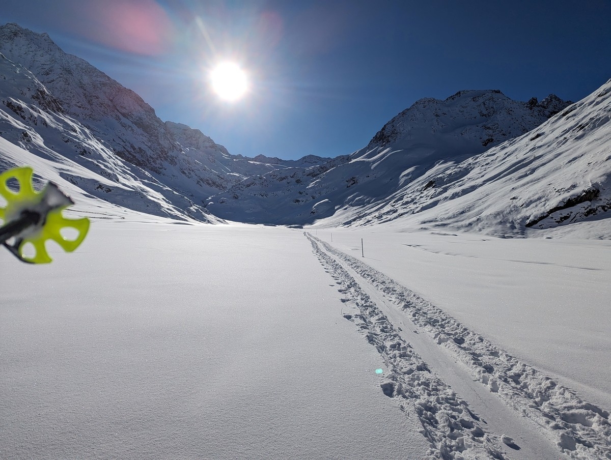- Steigeisen und Harscheisen als Back-up. Wird bei guter Schneelage nicht benötigt.
