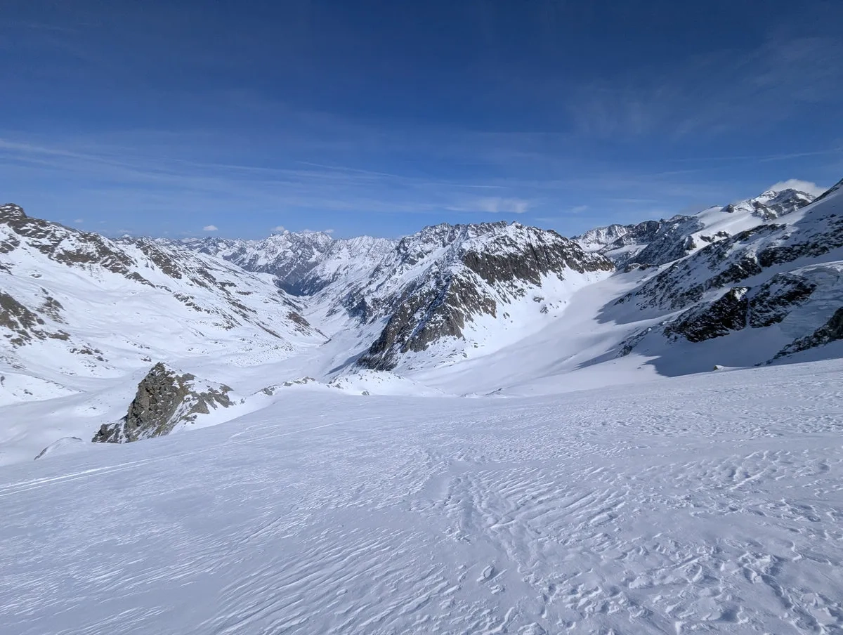 Vom Pitztal aus führt die Skitour durch das lange Taschachtal bis knapp unterhalb des Gipfels. Eine steile Flanke macht den letzten Abschnitt zwar nahezu unpassierbar, aber wer braucht schon einen Gipfel, wenn die Aussicht schon für sich spricht?