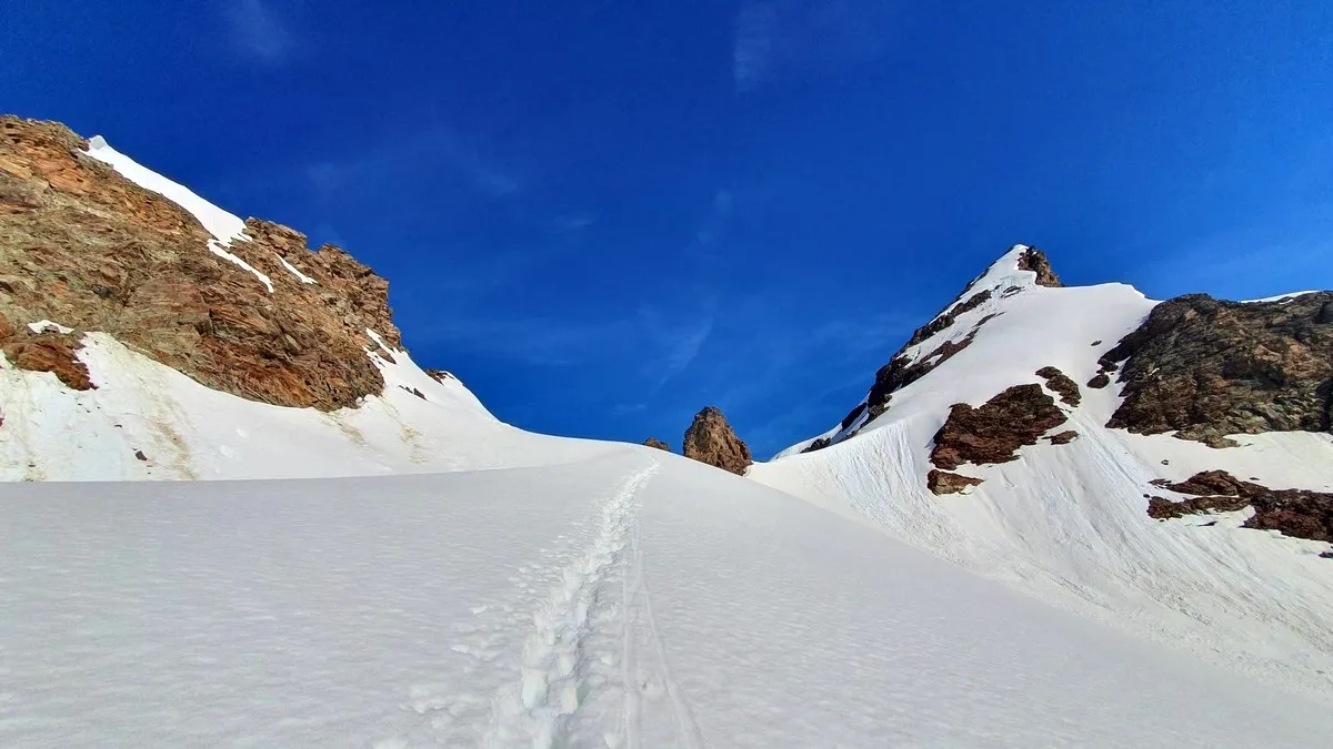 - Über einen großen Linksbogen am Gletscher etwas steiler bergauf Richtung Silvretta Egghorn und Silvrettahorn weiter. Die steile Wand zum Silvretta Egghorn wird links liegen gelassen, ehe etwa 200 Höhenmeter unter dem Silvrettahorn der Grat erreicht wird.