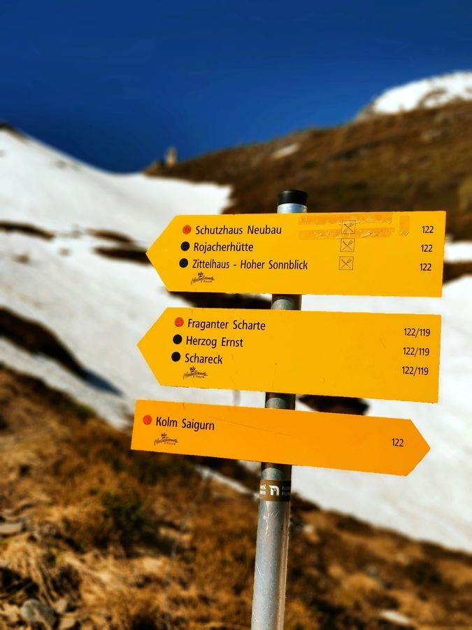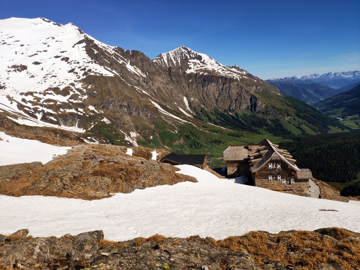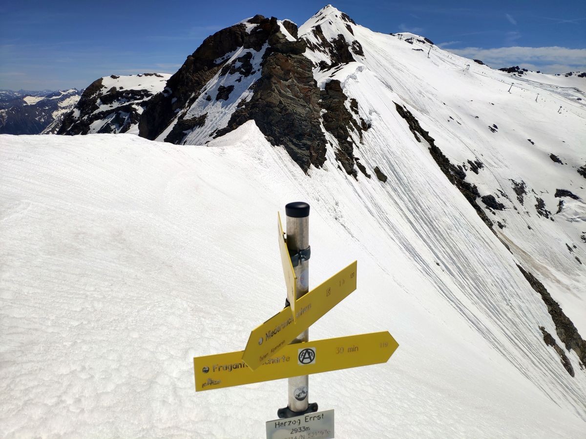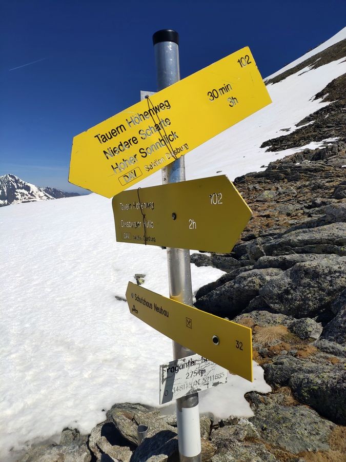 - Auf der Fraganter Scharte könnte man nun links auf die Herzog-Ernst-Spitze (2.933 m) aufsteigen und nun dem Grat (beschildert) zum Schareck folgen. Diese Route ist deutlich kürzer, aber bei Schnee im Worst Case nicht zu begehen (war Mitte Juni 2021 der Fall). Ansonsten von der Fraganter Scharte den Tauern Höhenweg Richtung Duisburger Hütte absteigen