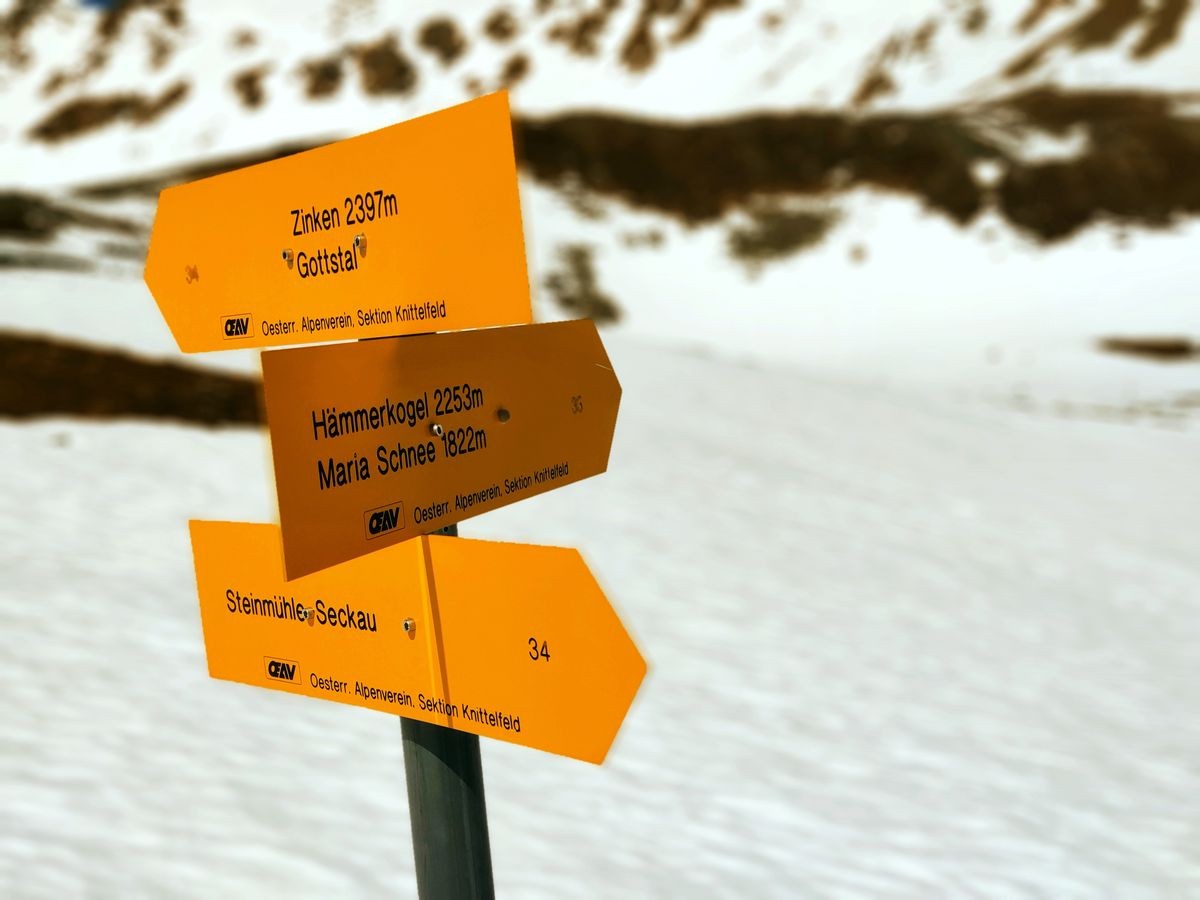 Gegen Ende des Grabens ist nun ein direkter Aufstieg links zum Seckauer Zinken möglich. Wer allerdings mehr von der Tour sehen möchte, folgt rechts bzw. geradeaus dem markierten Weg Richtung Hämmerkogel. Ist oben der Grat erreicht, geht es normalerweise links zum Hämmerkogel. Davor führt aber noch ein kurzer Abstecher nach rechts zur Schwaigerhöhe (Schild Hochalm, Maria Schnee). Nach gut einem Kilometer ist dieser 2.214 hohe Gipfel ohne Gipfelkreuz erreicht. Dort bietet sich ein traumhaftes Ambiente über die Seckauer Tauern.