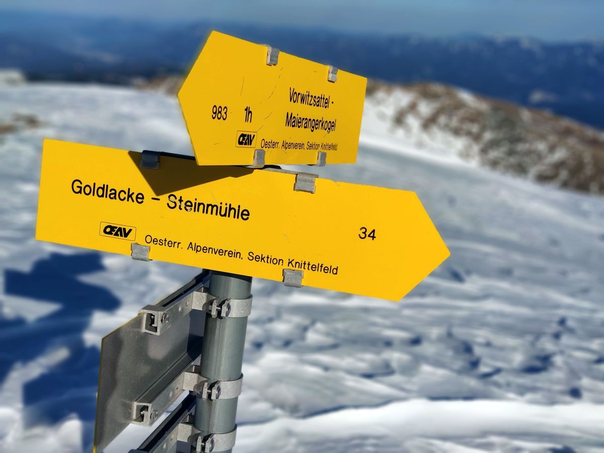 Vom Hauptgipfel geht es nun über den Weg 34 "Goldlacke - Steinmühle" wieder retour. Nach rund 4,5 Kilometern trifft der Abstiegsweg wieder auf dem Aufstiegsweg, wo es nun wieder weiter zum Gasthof Steinmühle geht.