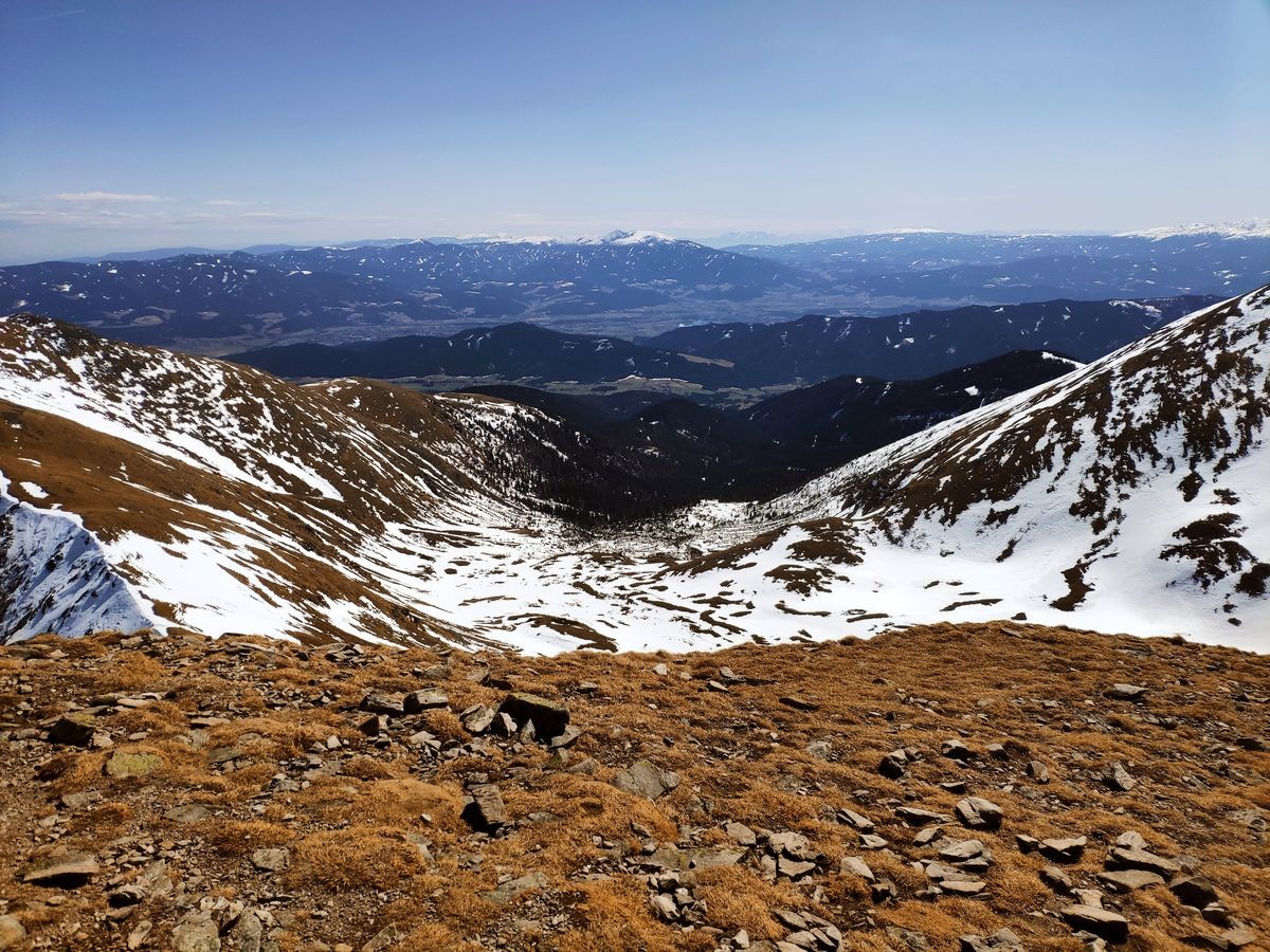 Nachdem der Wald passiert ist, geht es nun lange durch einen Graben, wo ein fantastischer Ausblick auf alle Gipfelziele garantiert ist. Halb links ist der Seckauer Zinken zu sehen, rechts daneben der Hämmerkogel und rechts neben dem Graben die Schwaigerhöhe. Und wer einen Blick zurück riskiert, entdeckt das traumhafte Alpenpanorama Richtung Seckau-Tal.