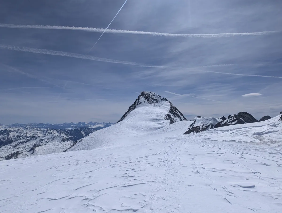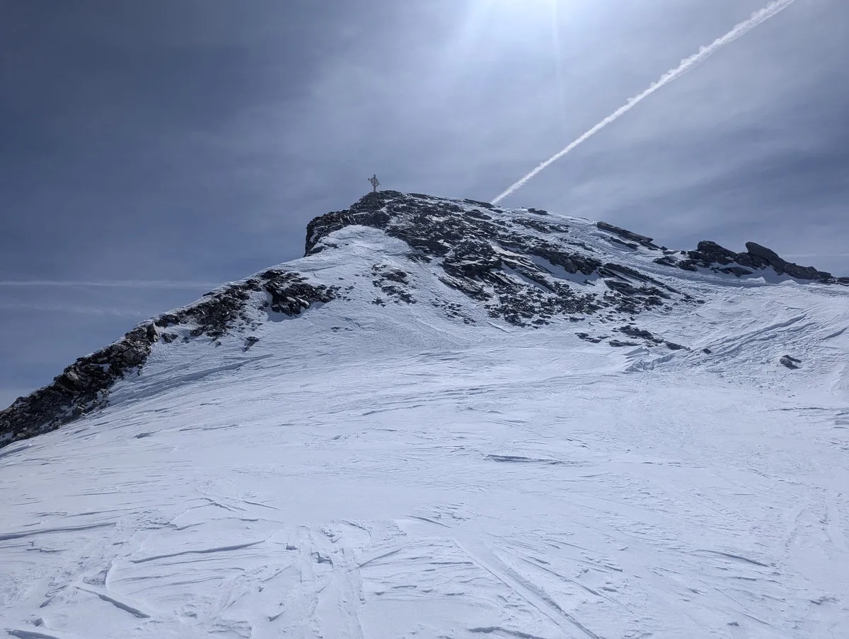 • Nun folgt der Schlussteil nach Südosten bis zum 3.475 Meter hohen Gipfel. Bei guter Schneelage geht das problemlos mit Ski. In schneearmen Wintern heißt es: abschnallen und die letzten Meter zu Fuß absolvieren. Der Gipfel wartet geduldig.