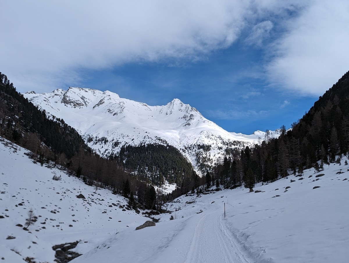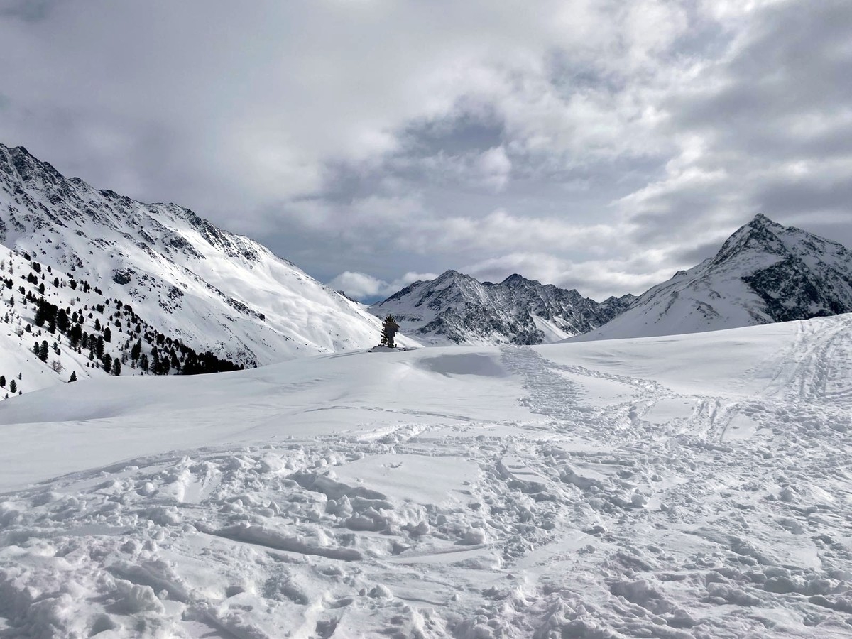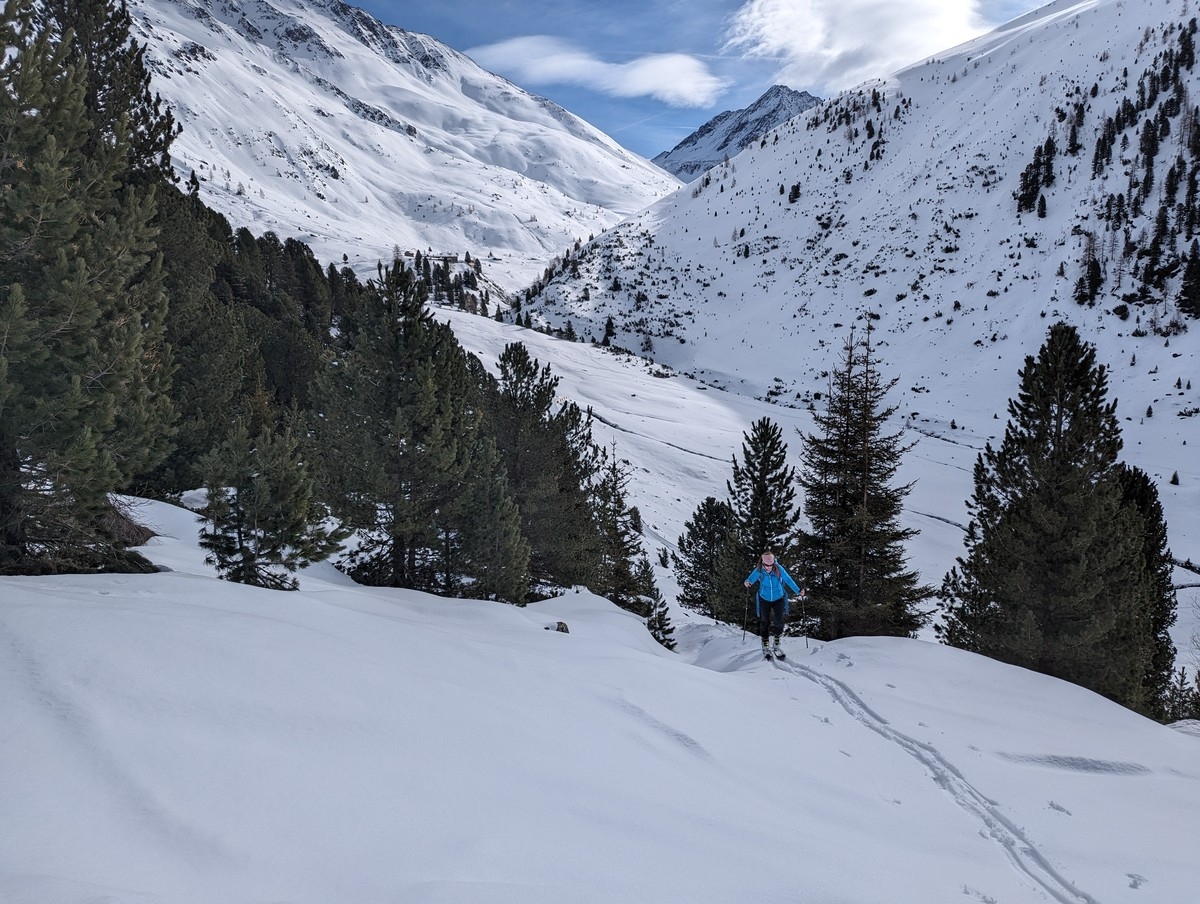 Nach dem etwas eintönigen Beginn auf der 5 km langen Rodelbahn im Horlachtal, wird die Skitour im Finstertal zunehmend spannender.