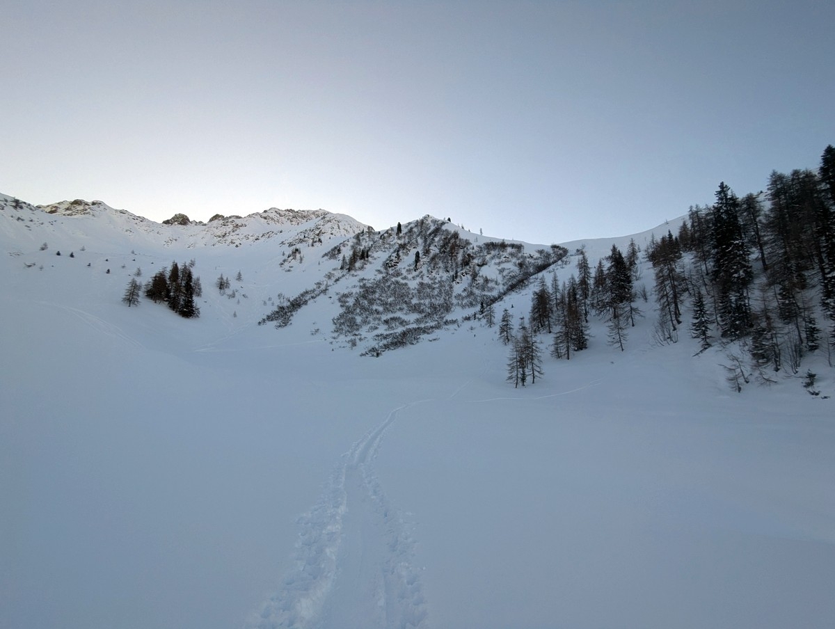 - Abfahrt: Viele entscheiden sich, direkt von der Hütte abzufahren. Alternativ bieten steile Nordhänge und die Gegend oberhalb der Materialseilbahn spannende Herausforderungen. Ein kurzer Zwischenanstieg ohne Felle zu diesen Abfahrten oberhalb der Materialseilbahn ist möglich.