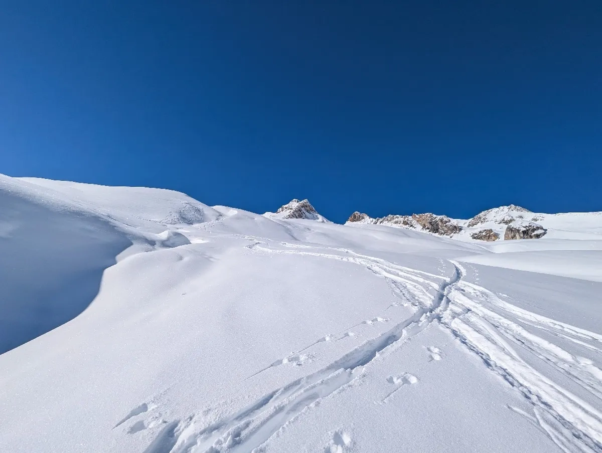 Exposition: Süd bis Ost. Der letzte Abschnitt vor dem Skidepot liegt im Nordosten und bleibt somit teilweise im Schatten.