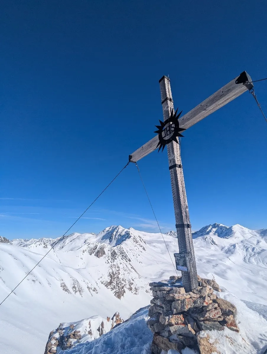 - Skidepot am Joch, dann der finale Aufstieg zu Fuß zum Gipfel – je nach Schneelage ein Kinderspiel oder eine kleine Herausforderung. Nach 5 bis 10 Minuten sollte aber der Gipfel erreicht sein. Vom Gipfel kann man oft auch Freerider beobachten, die über die Skigebiete in Samnaun und Serfaus-Fiss-Ladis diese Gegend ansteuern.
