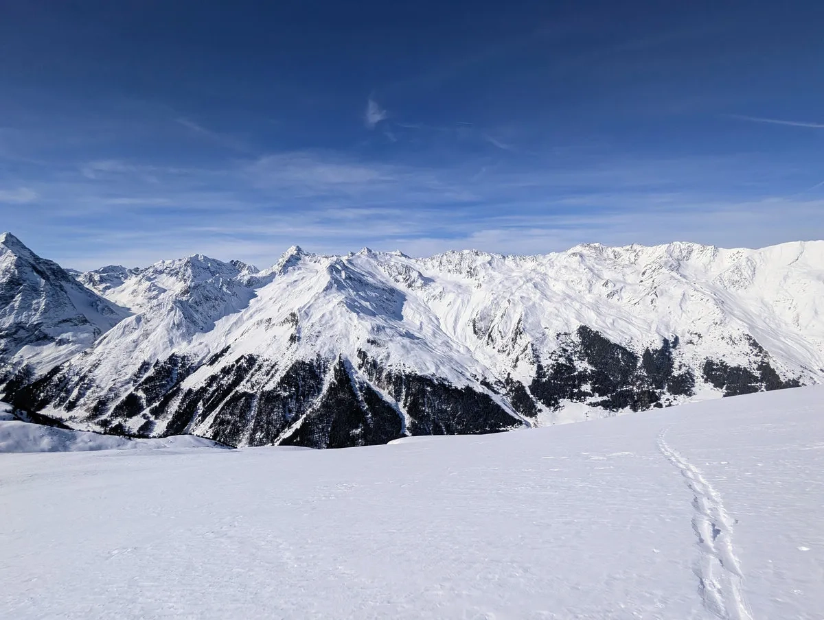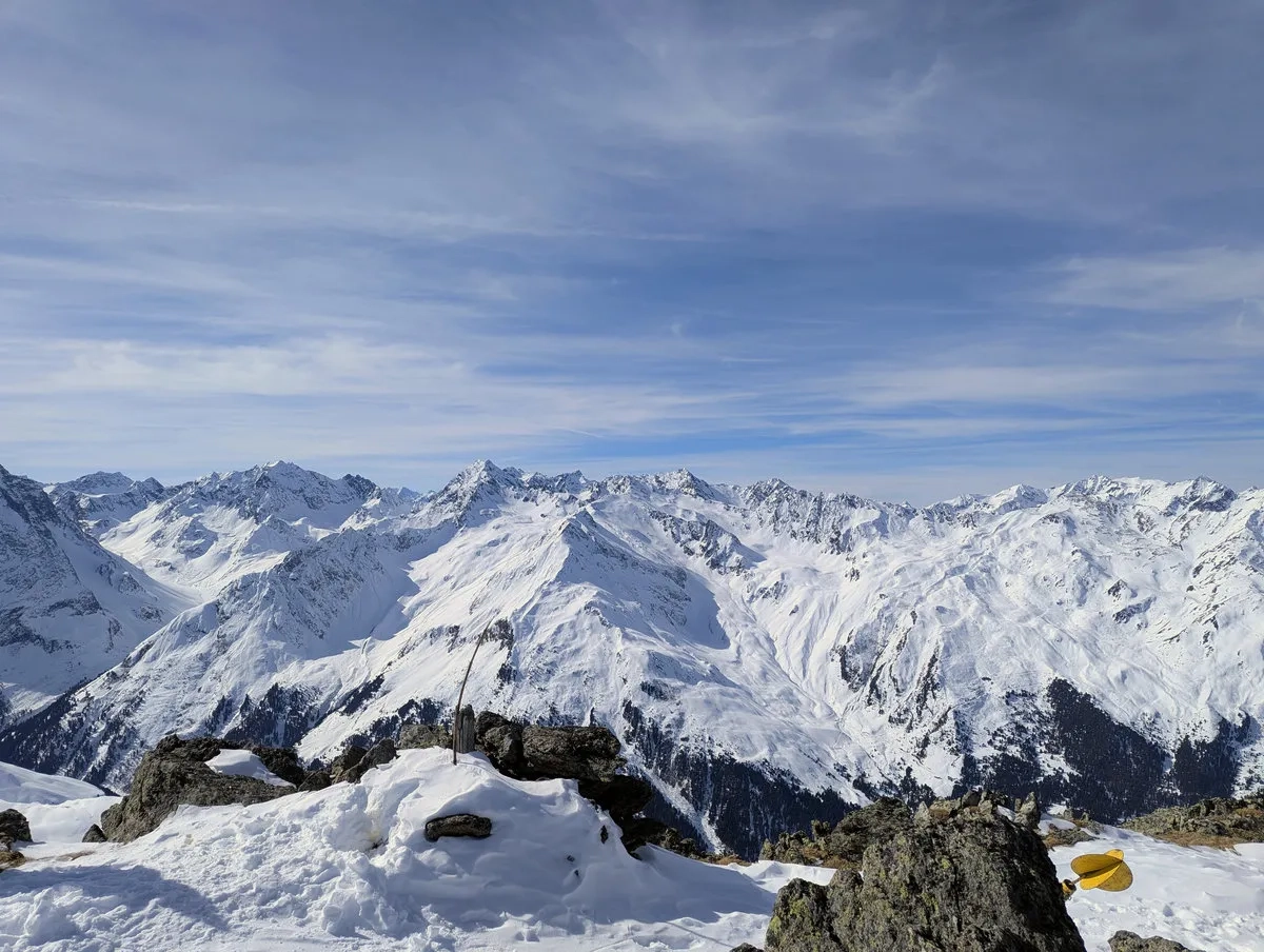 Der Rote Kogel verdankt seinen Namen übrigens den rötlichen Gesteinsschichten, die an schneearmen Tagen durchaus sichtbar werden. Im Winter bleibt davon zwar meist nur eine Ahnung übrig, doch die Aussicht vom Gipfel gehört zu den schönsten im gesamten Sellrain: gegenüber ragen mächtige Dreitausender wie der Lüsener Fernerkogel oder der Schrankogel auf. Wer hier oben steht, versteht ziemlich schnell, warum diese Region zu den Skitouren-Hotspots Tirols gehört.