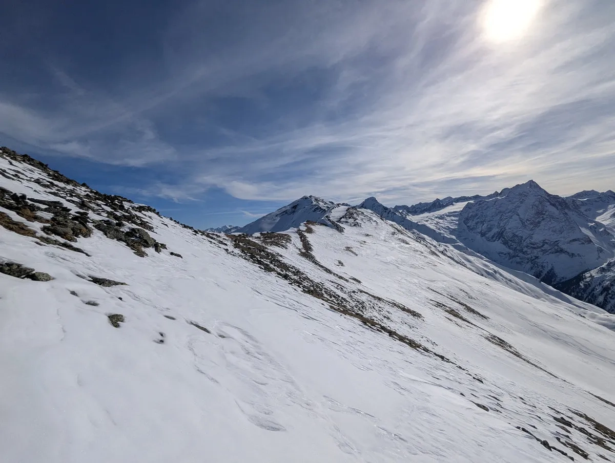 - Gegen Ende des Aufstiegs Richtung Süden zum Roten Kogel nähert man sich dem Gipfelkamm. Bei guter Schneelage gelangt man mit den Skiern bis zum Gipfel, andernfalls sind ein paar Schritte zu Fuß kein Drama.