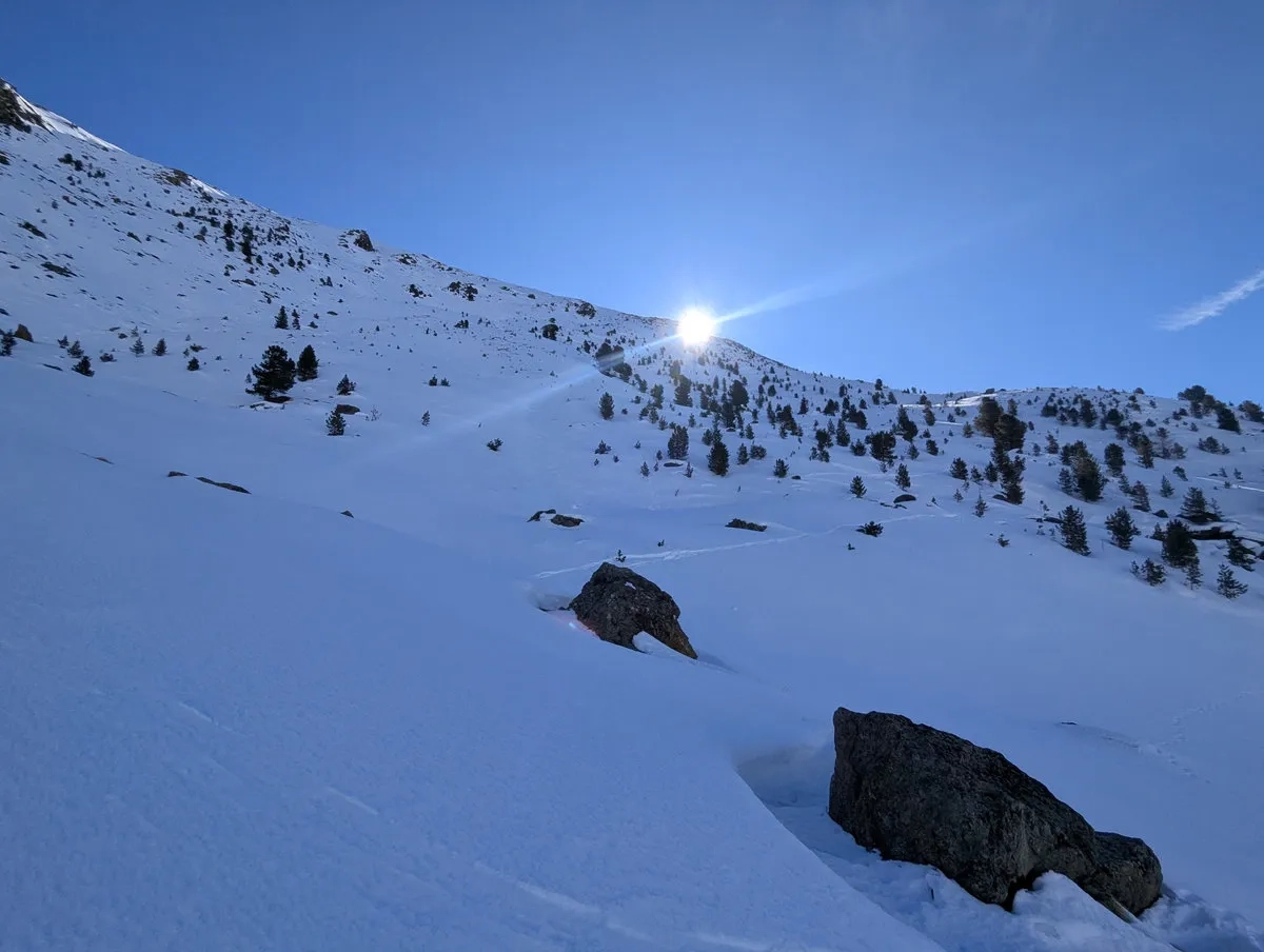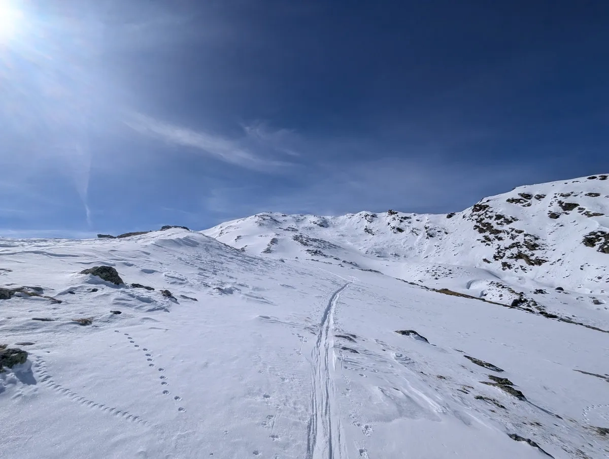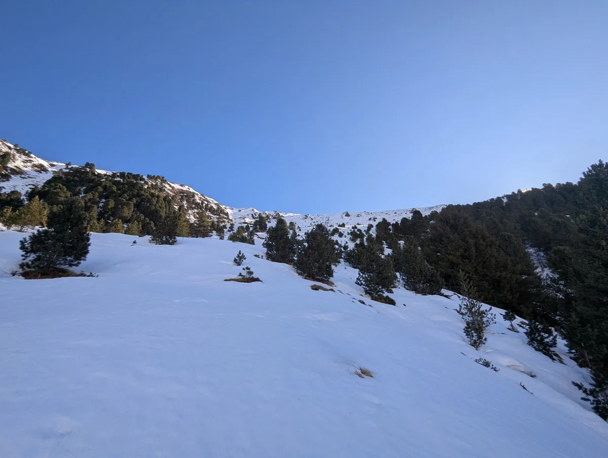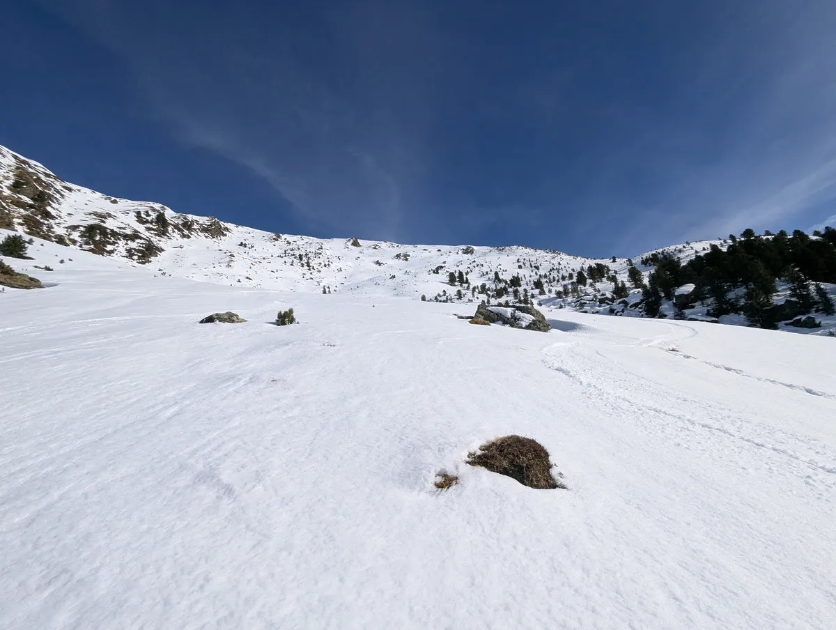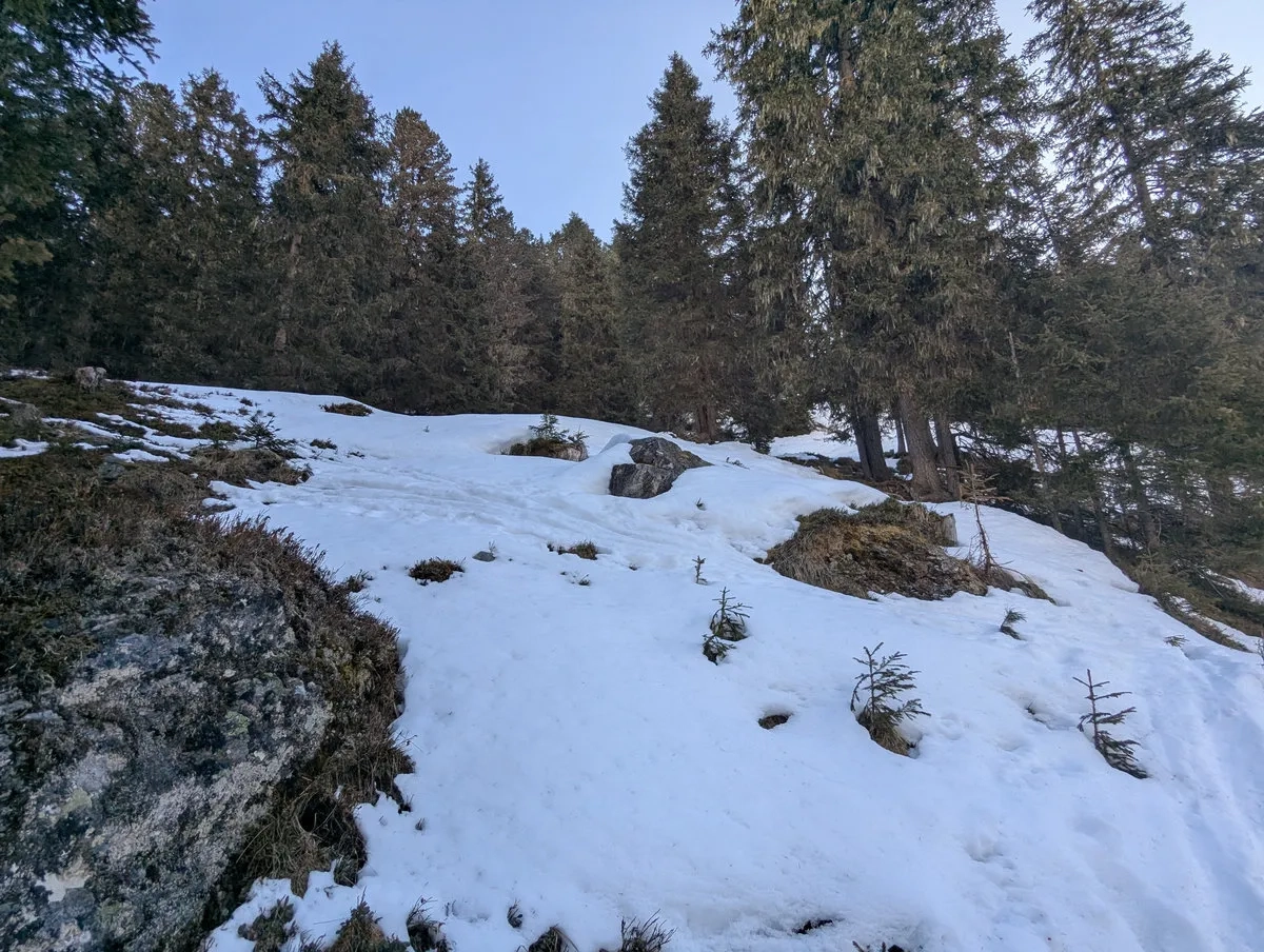 - Doch auch danach bleibt es spannend. Die Route ist stellenweise schneearm, und gelegentlich lässt sich Ski tragen kaum vermeiden. Nachdem sich der Wald langsam lichtet, weicht man etwas nach rechts aus und steigt über einen steilen Kamm auf ein breites Plateau auf. Auch dieser Kamm kann tückisch sein: Entweder so vereist, dass ohne Harscheisen kaum ein sicherer Aufstieg möglich ist, oder so schneearm, dass man ein Stück zu Fuß gehen muss.