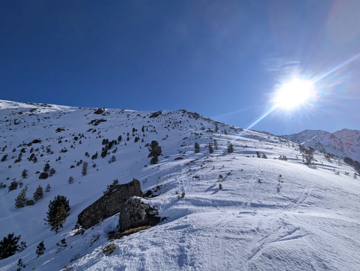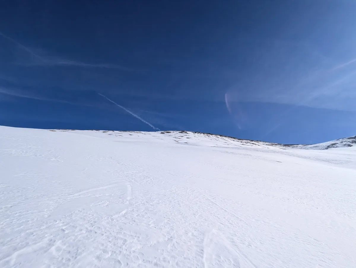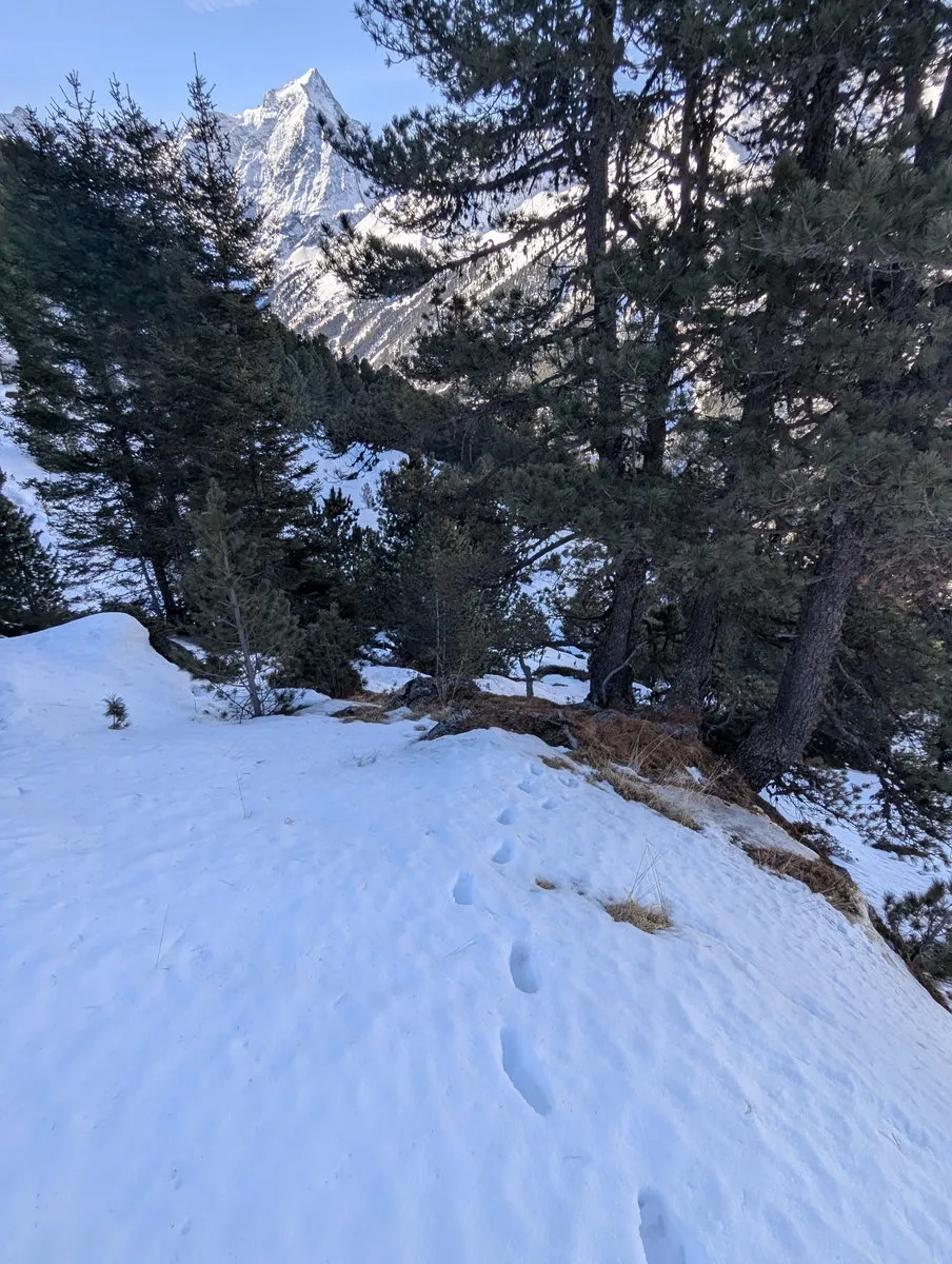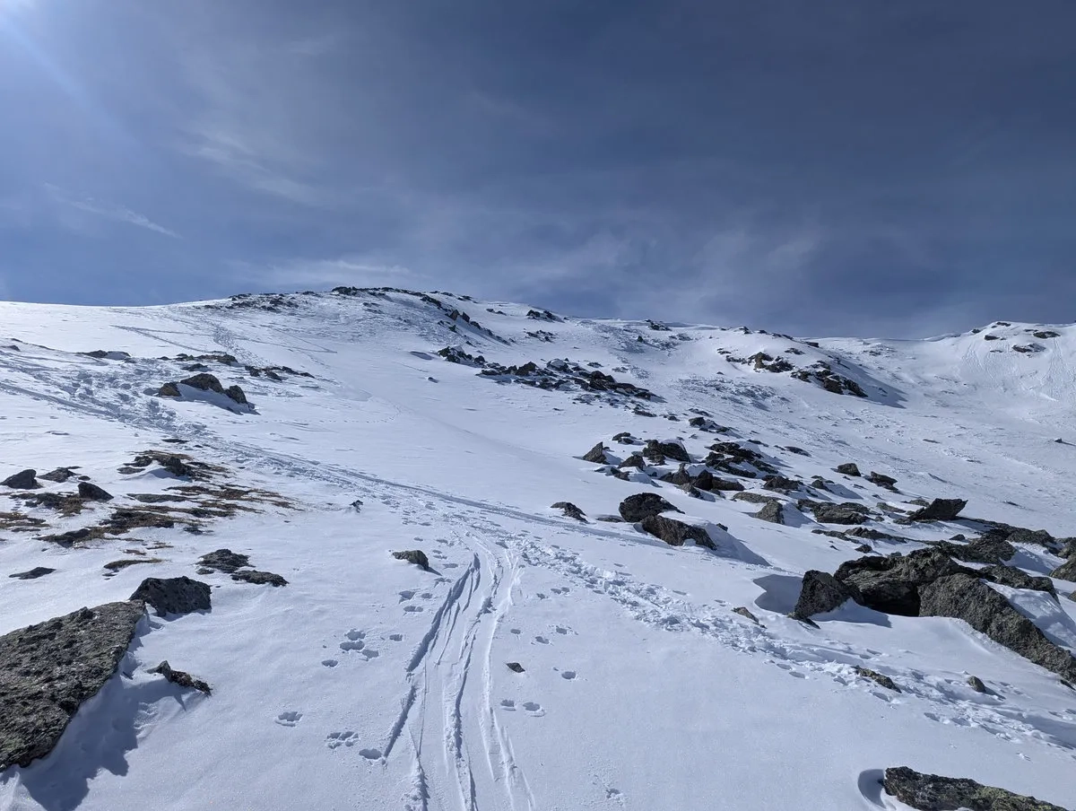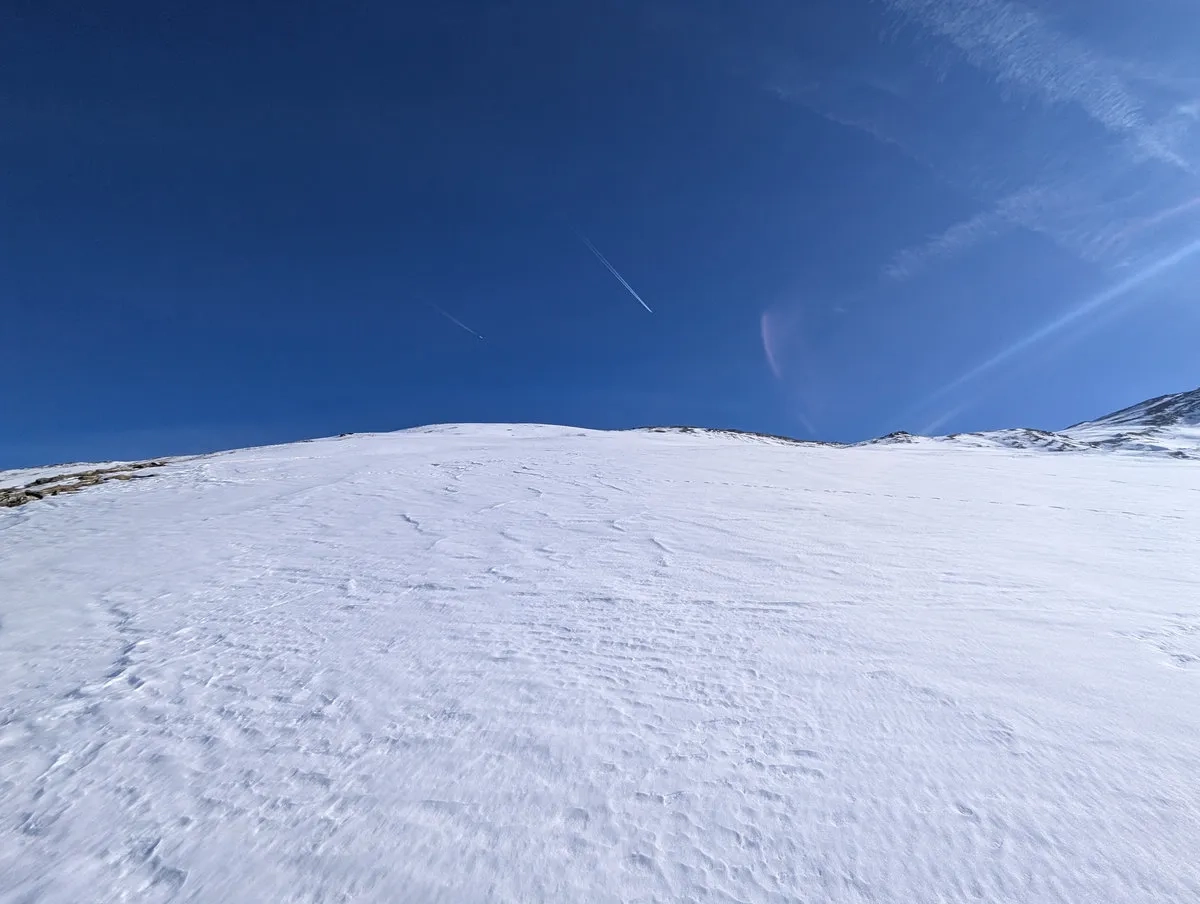 - Doch auch danach bleibt es spannend. Die Route ist stellenweise schneearm, und gelegentlich lässt sich Ski tragen kaum vermeiden. Nachdem sich der Wald langsam lichtet, weicht man etwas nach rechts aus und steigt über einen steilen Kamm auf ein breites Plateau auf. Auch dieser Kamm kann tückisch sein: Entweder so vereist, dass ohne Harscheisen kaum ein sicherer Aufstieg möglich ist, oder so schneearm, dass man ein Stück zu Fuß gehen muss.