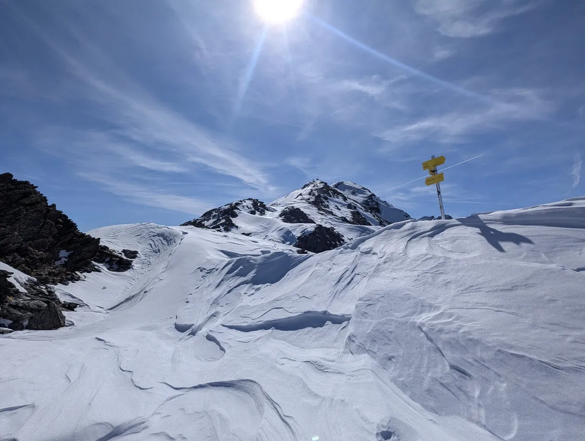 - Wer sich für den zähen Aufstieg belohnen möchte, fährt vom Roten Kogel Richtung Osten beziehungsweise Nordosten ab, denn dort sind die Schneebedingungen häufig deutlich besser. Nach rund 200 Höhenmetern gleitet man nach links und trifft auf etwa 2.400 Metern Höhe auf den Ostaufstiegsweg zum Sömen. Über diesen steigt man in rund 400 Höhenmetern zum 2.798 Meter hohen Gipfel auf.